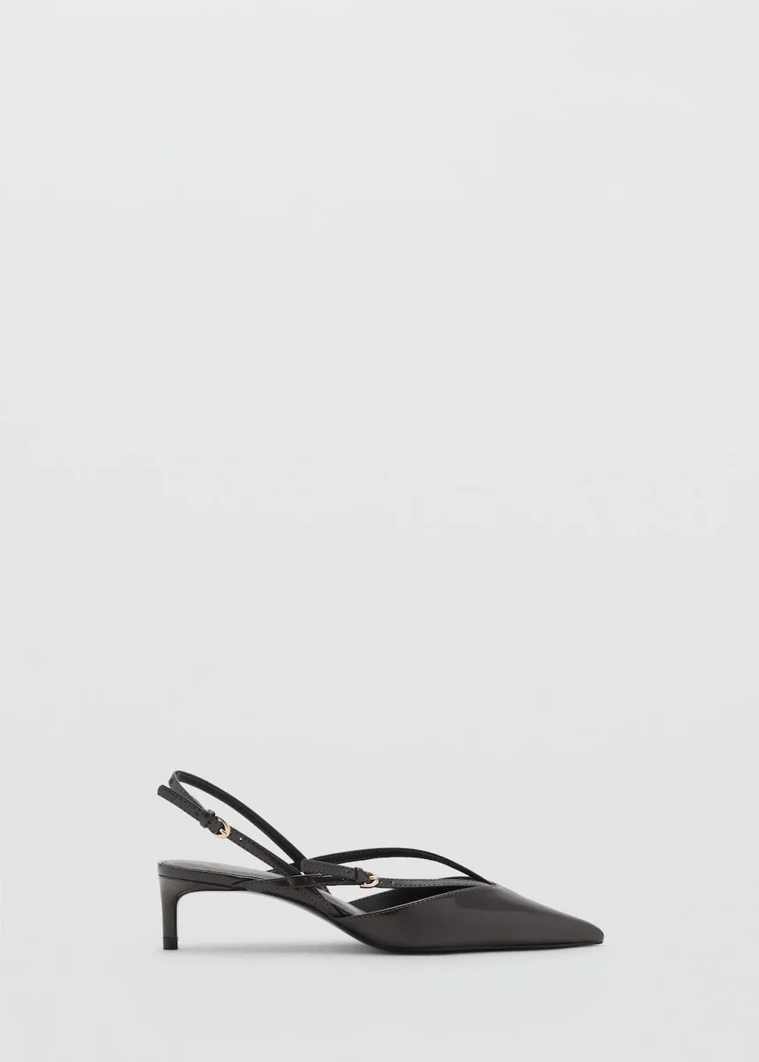 Efekt lakované kůže. Design s pásky. Špičaté. Ozdobná spona. Nízký podpatek. Zapínání na sponu u kotníku. Podpatek 5 cm