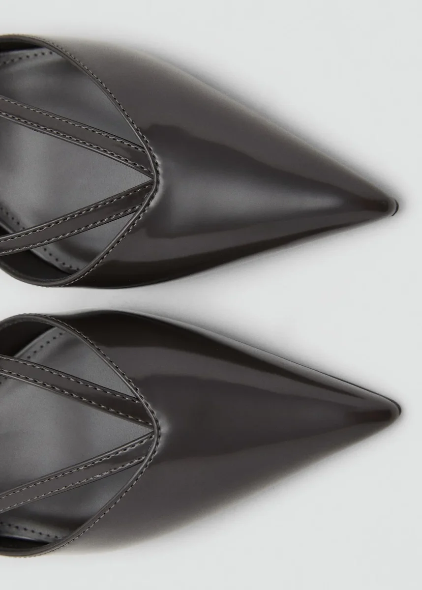 Efekt lakované kůže. Design s pásky. Špičaté. Ozdobná spona. Nízký podpatek. Zapínání na kotníku pomocí spony. Výška podpatku 5 cm.