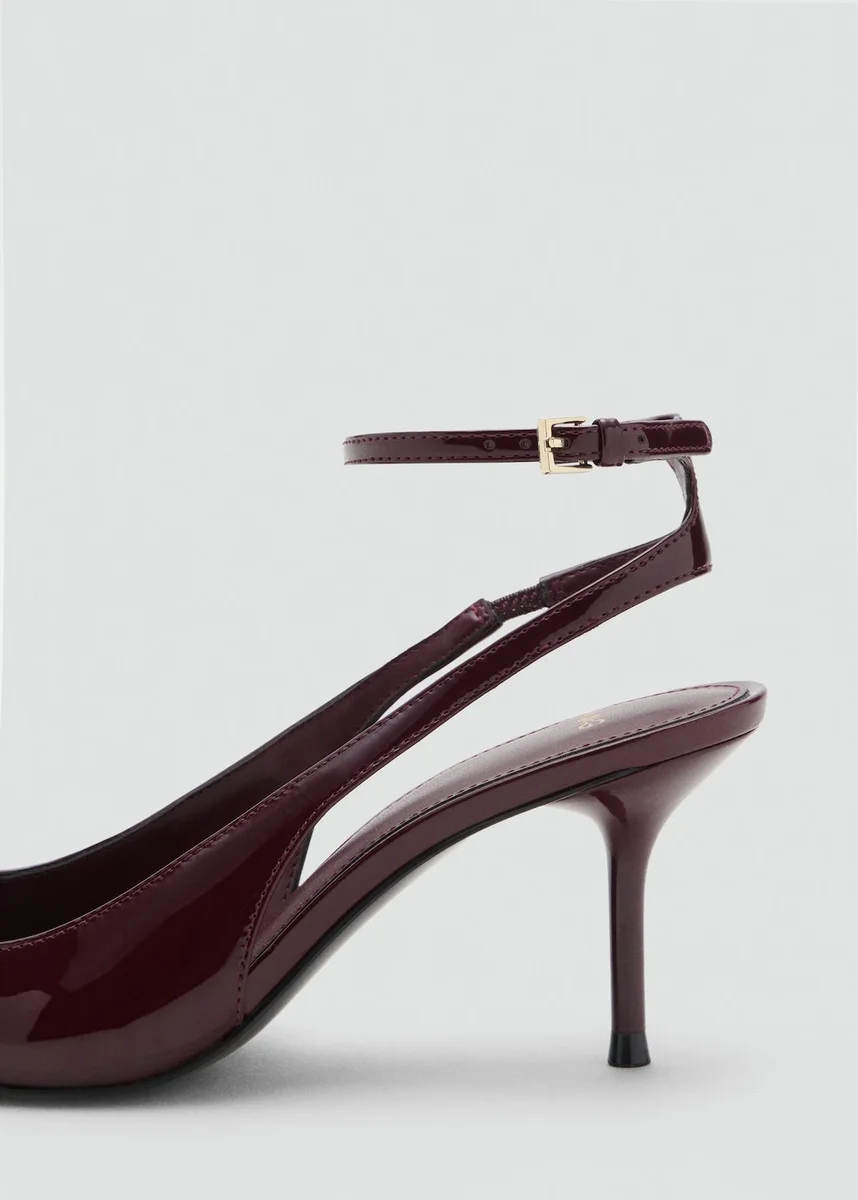 Efekt lakované kůže. Špičaté. Jehlový podpatek. Podpatek 2,95 palce. Zapínání na přezku u kotníku