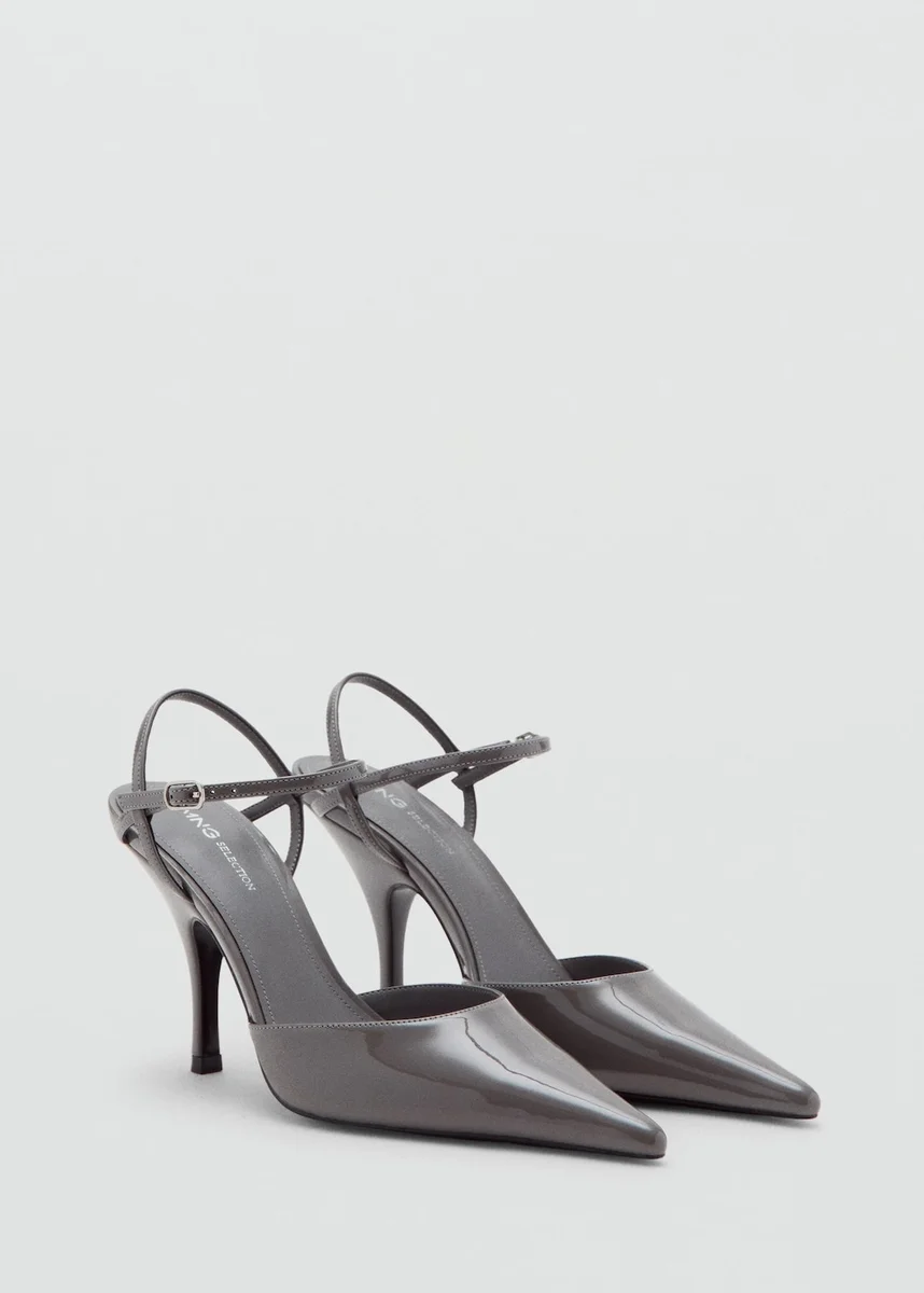 Efekt lakované kůže. Špičaté. Podpatky ve tvaru trychtýře. Zapínání na kotníkovém pásku s kovovou sponou. Výška podpatku je 10 cm. Exkluzivně online.