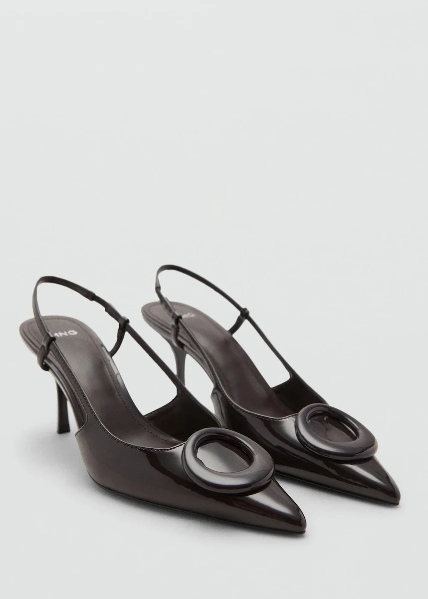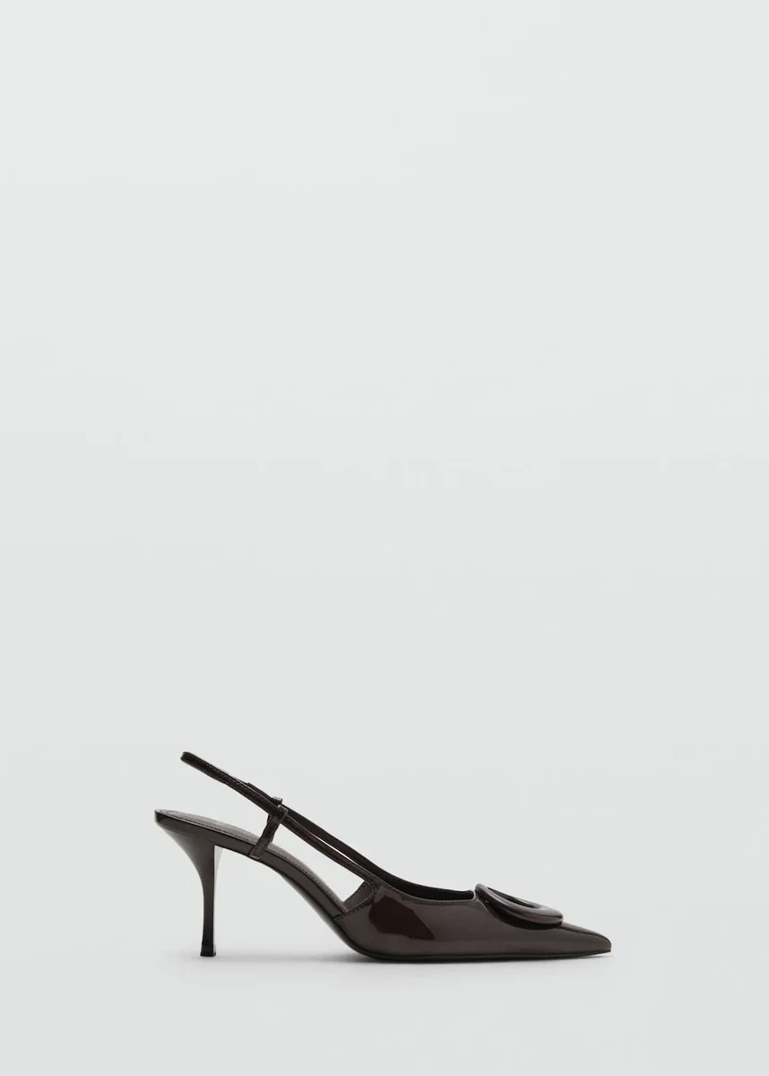 Lakovaný povrch. Design se zapínáním na patě. Špičatá špička. Modrá potištěná mikina. Jehlový podpatek. Výška podpatku 3,15 palce