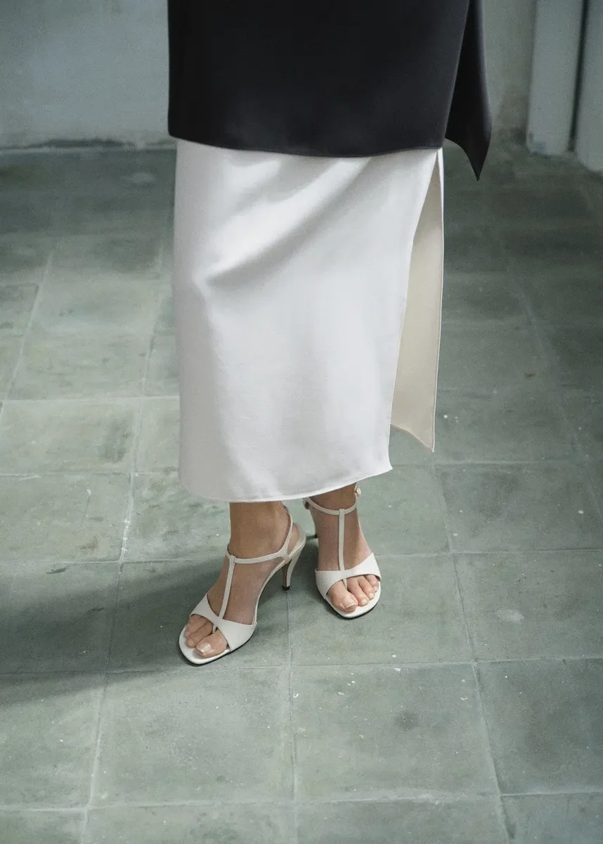 100% kozí kůže. Design s pásky. Otevřená špička. Podpatky ve tvaru trychtýře. Podpatky 3,74 palce. Zapínání na přezku u kotníku. Exkluzivně online.