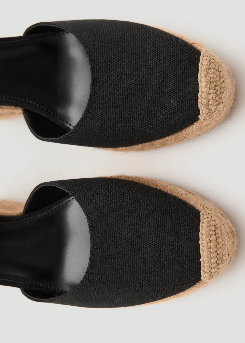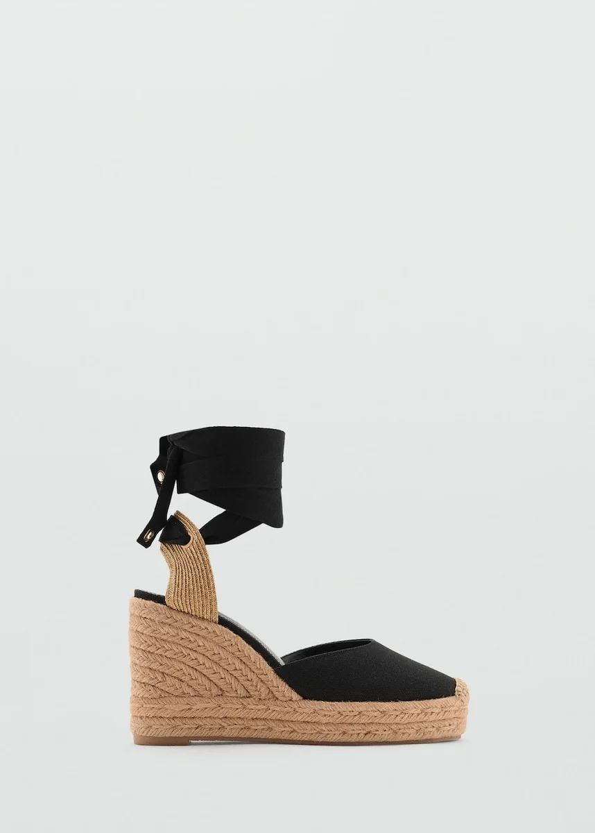Design s páskem přes patu. Kombinovaný design. Zaoblená špička. Klínový podpatek. Výška podpatku je 10 cm. Zapínání na pásek kolem kotníku.