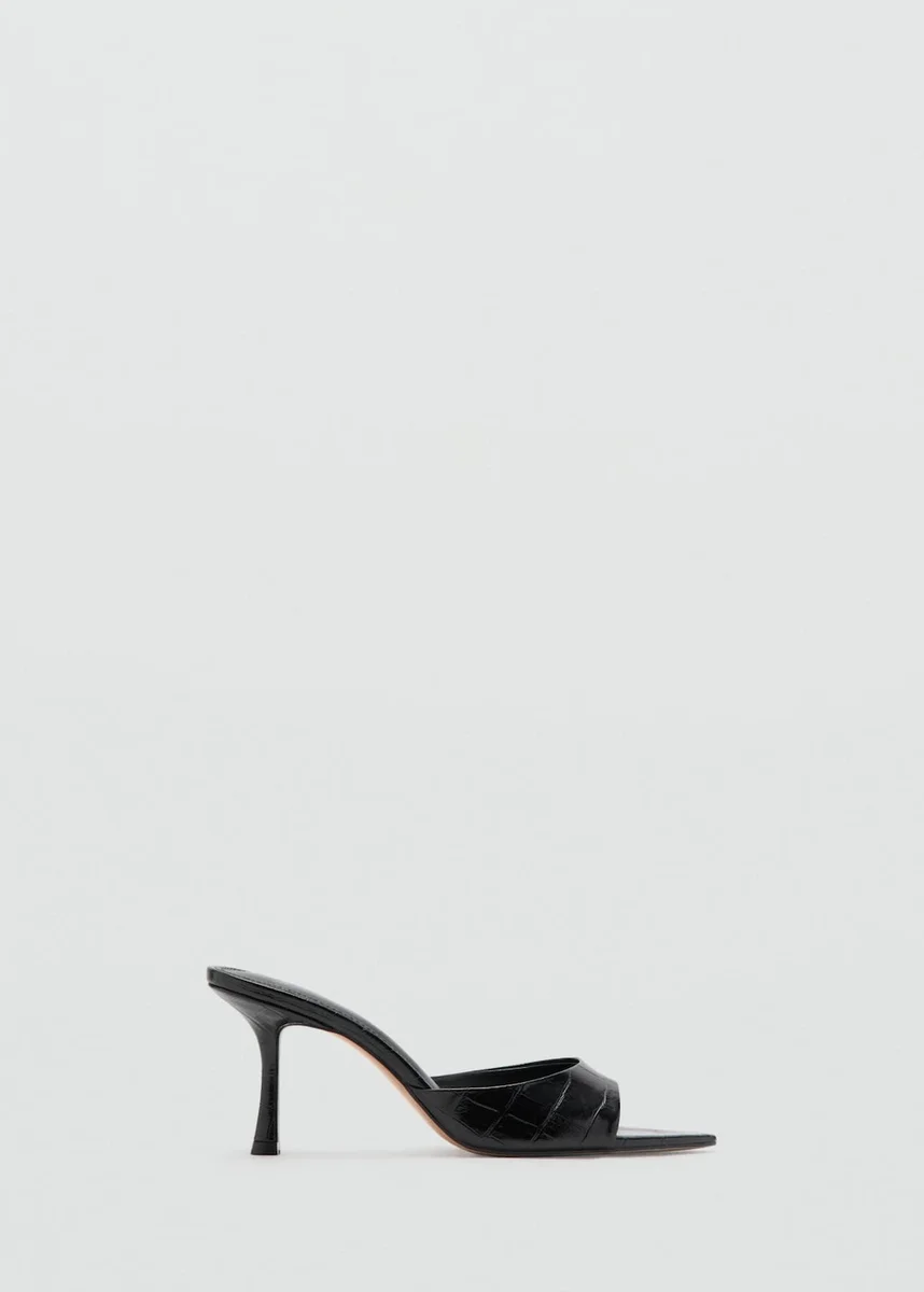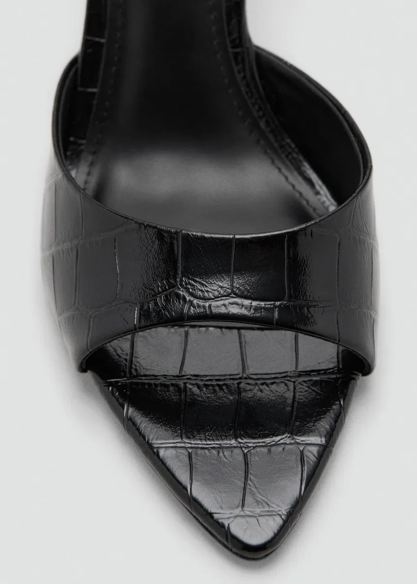 Krokodýlí efekt. Design se zapínáním na patě. Špičaté. Jehlový podpatek. Bez zapínání. Podpatek 3,15 palce