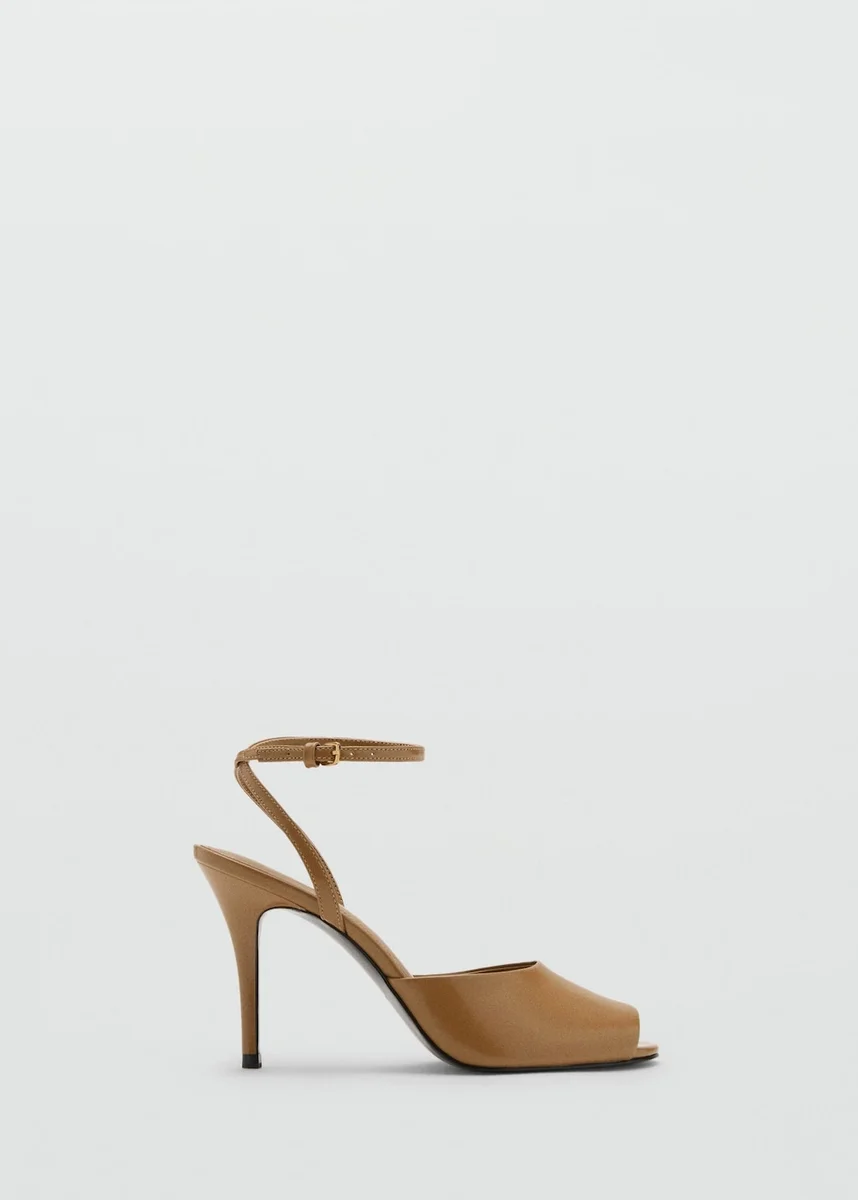 Kožený efekt. Otevřená špička. Podpatek ve tvaru trychtýře. Výška podpatku je 10 cm. Zapínání na přezku u kotníku. Exkluzivně online.