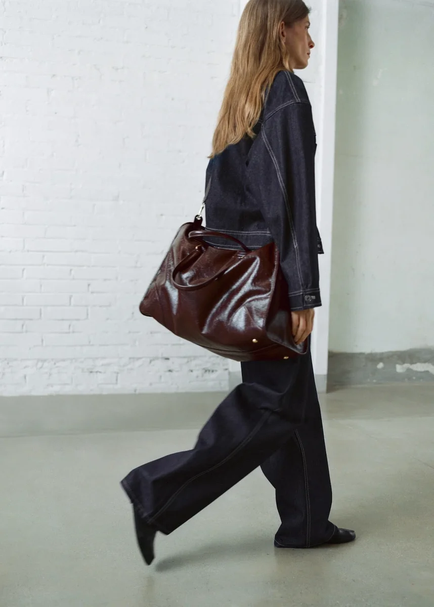 Bavlněná džínovina. Dlouhý střih. Balónový střih. Barrel styl. Vysoký pas. Poutka na pásek. Pět kapes. Zapínání na knoflík a zip. Vnitřní délka 81,5 cm. Total look.