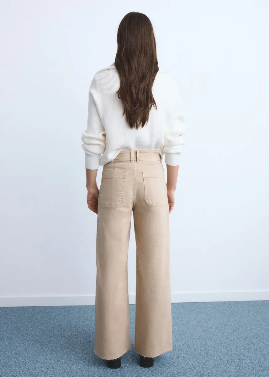 Bavlněná džínovina. Elastický materiál. Design culotte. Kotníkové. Vysoký pas. Poutka na pásek. Zadní kapsy. Zapínání na zip a knoflík. Roztřepený lem. Vnitřní šev 72 cm. K dispozici ve velikostech Plus. Dvě našité kapsy vzadu. Pohodlný materiál s elasticitou.