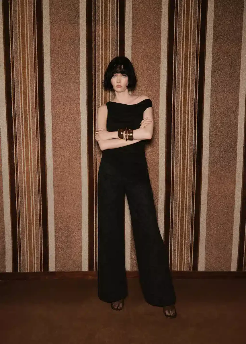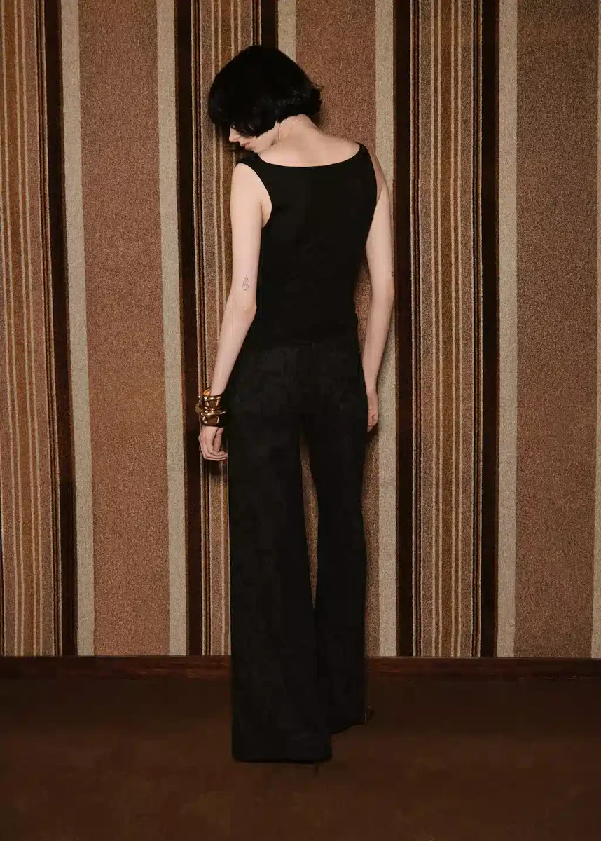 Bavlněná džínovina. Dlouhý střih. Široké nohavice. Paisley potisk. Vysoký pas. Poutka na opasek. Pět kapes. Zapínání na zip a knoflík vpředu. Black Friday