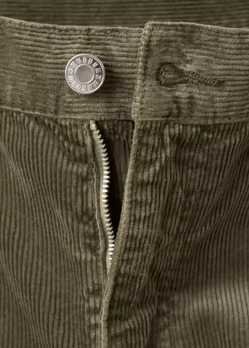 Manšestr. Dlouhý střih. Široké nohavice. Vysoký pas. Poutka na opasek. Pět kapes. Zapínání na knoflík a zip. Podšívka 100 % bavlna. Pohodlný materiál s elasticitou