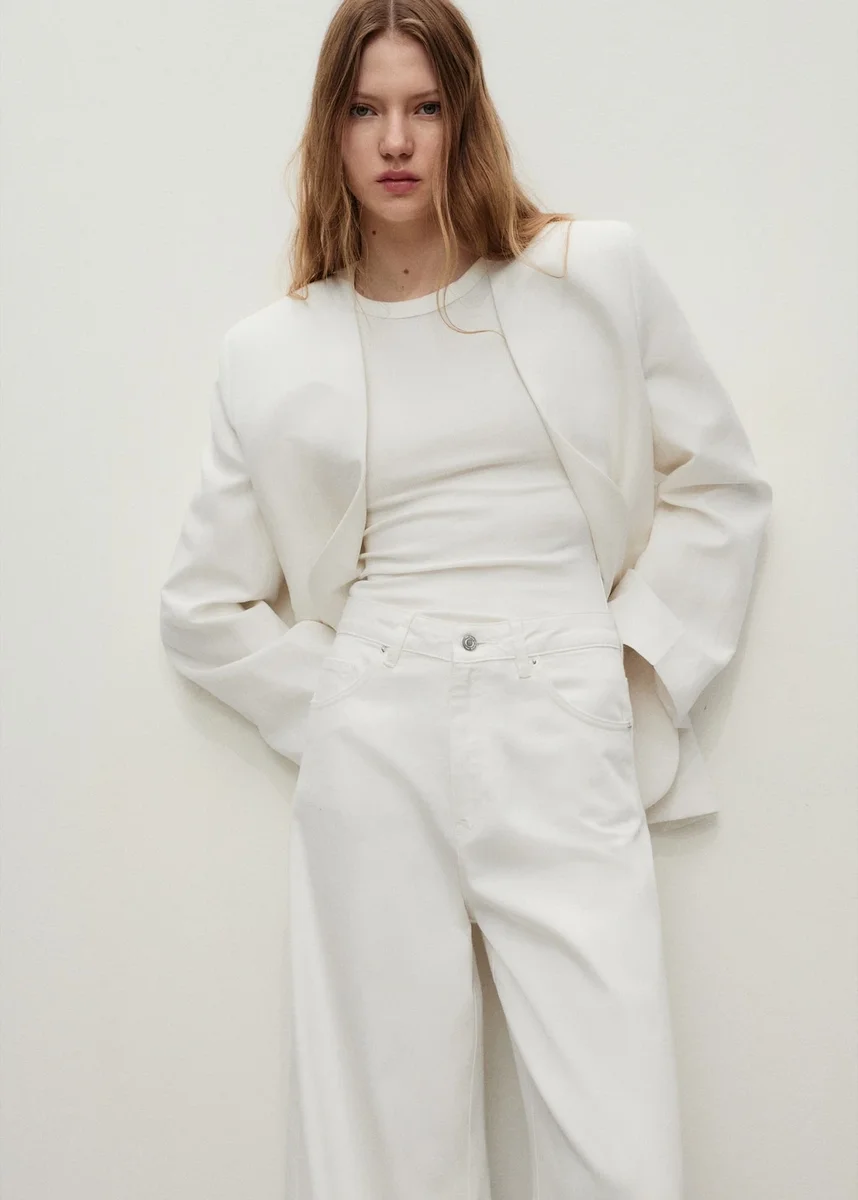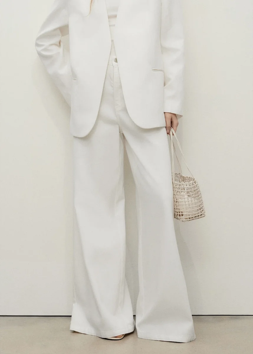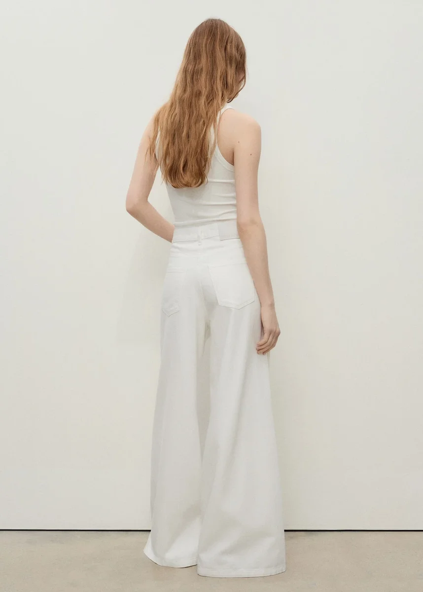 Bavlněná džínovina. Široké nohavice. Dlouhý střih. Celková délka. Vysoký pas. Poutka na opasek. Pět kapes. Zapínání na zip a knoflík vpředu.