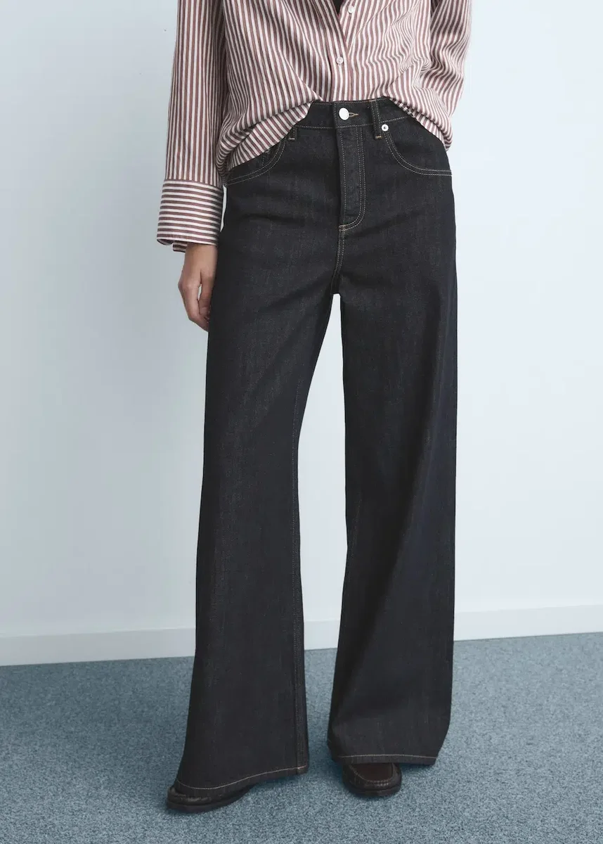 Bavlněná džínovina. Dlouhý střih. Široké nohavice. Střední výška pasu. Poutka na opasek. Pět kapes. Zapínání na knoflíky vpředu. Vnitřní šev 32,3 palce
