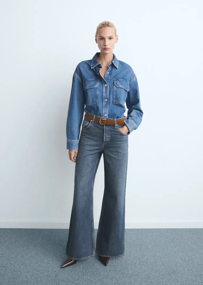 Bavlněná džínovina. Dlouhý střih. Široké nohavice. Vysoký pas. Poutka na opasek. Pět kapes. Zapínání na knoflíky