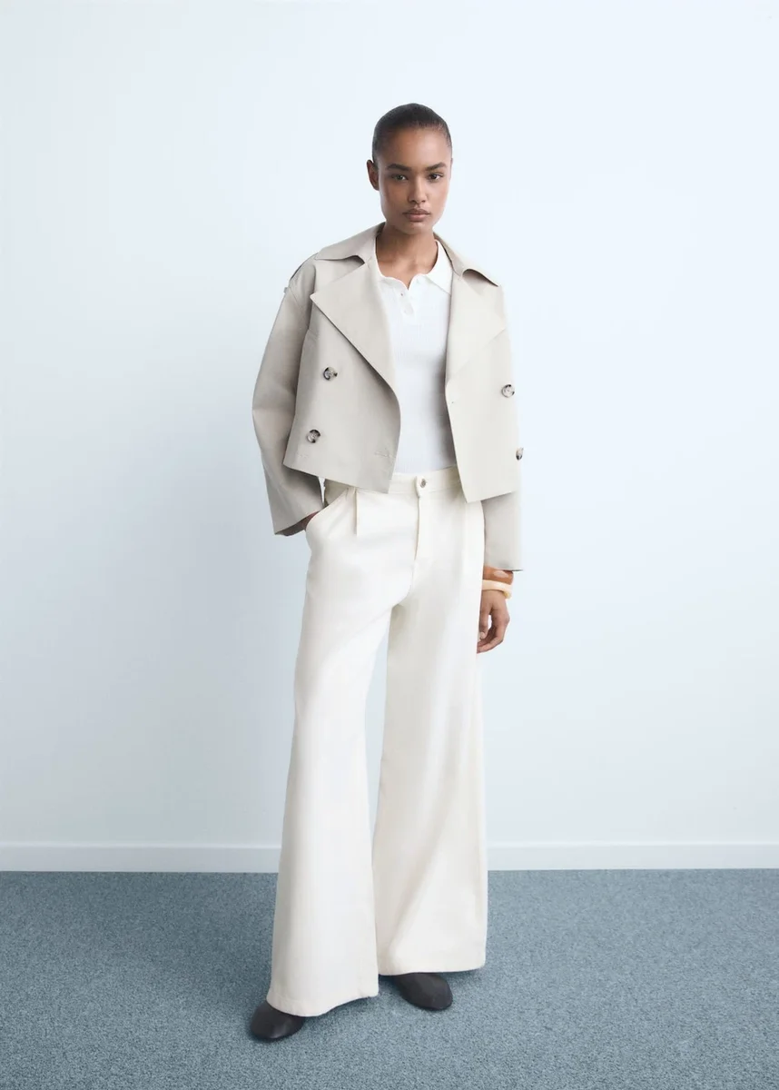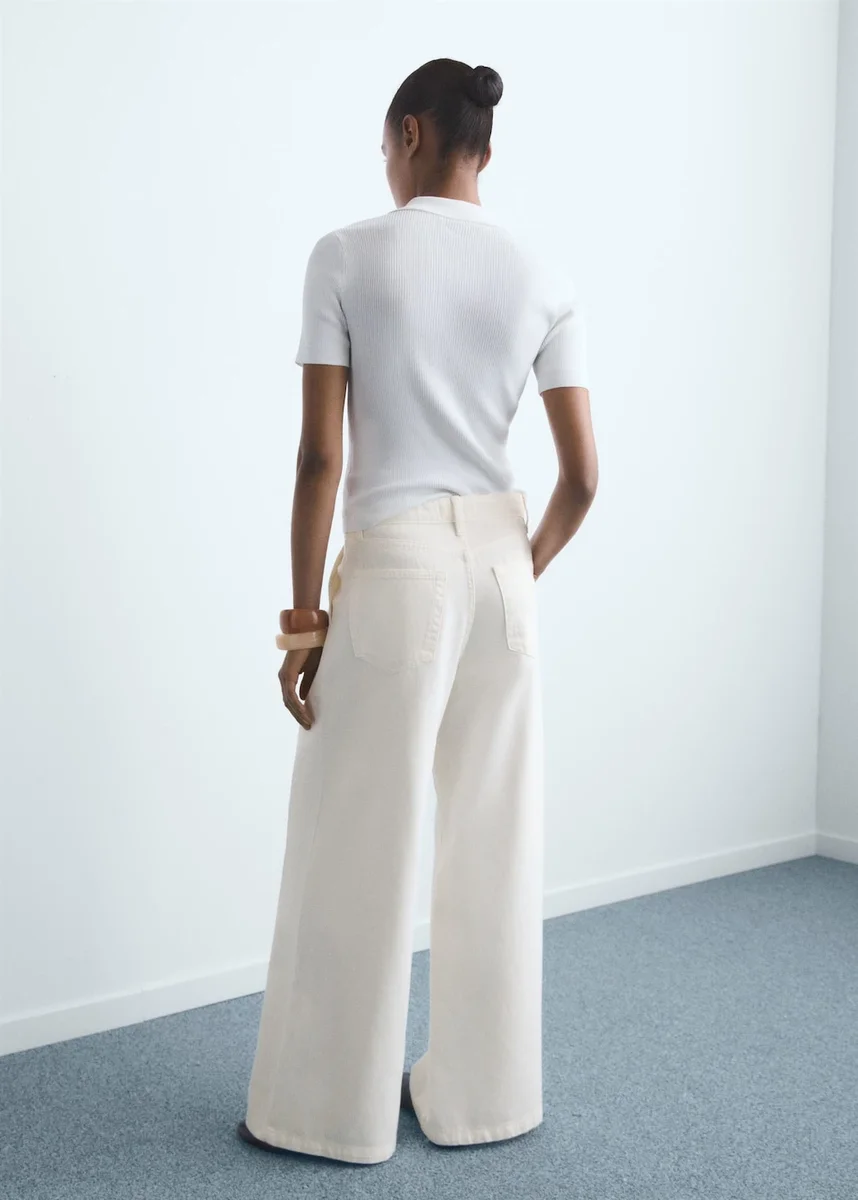 Bavlněná džínovina. Dlouhý střih. Široké nohavice. Střední výška pasu. Poutka na opasek. Přední záhyb. Džíny se zavazováním. Zapínání na knoflík a zip. Délka nohavic 81 cm