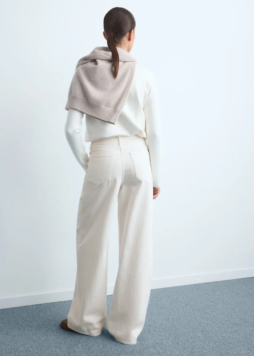 Bavlněná džínovina. Dlouhý střih. Široké nohavice. Nízký pas. Poutka na opasek. Pět kapes. Skryté zapínání na knoflík, háček a zip. Vnitřní délka 81,5 cm
