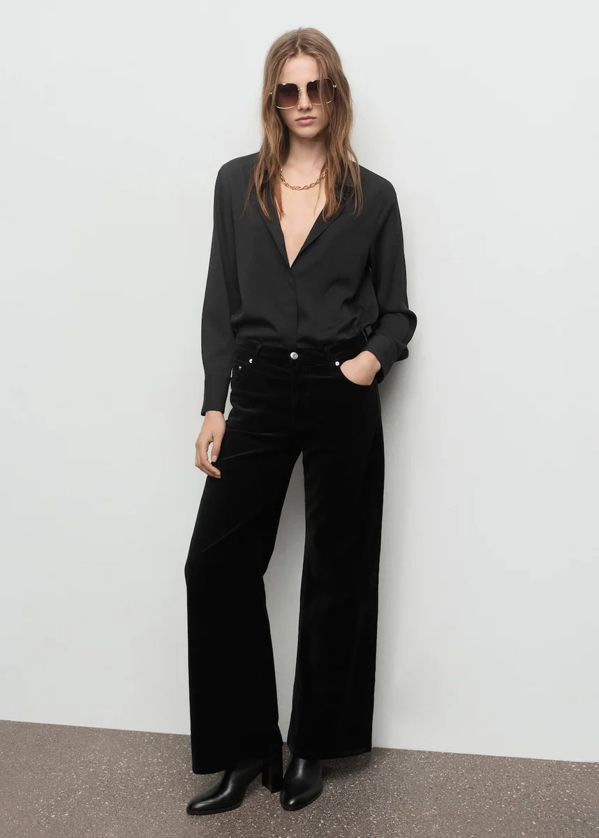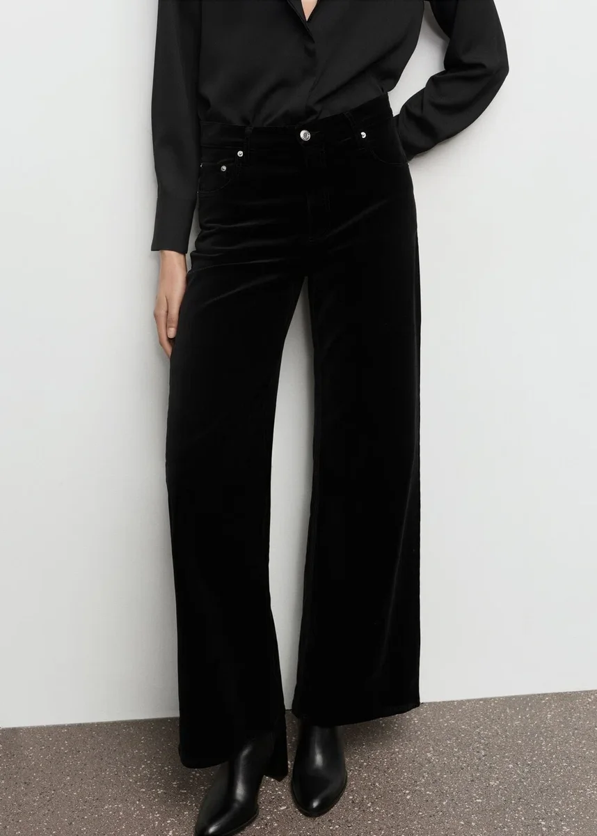 Sametová tkanina. Dlouhý střih. Široké nohavice. Střední výška pasu. Poutka na opasek. Pět kapes. Zapínání na knoflík a zip. Pohodlná tkanina s elasticitou.