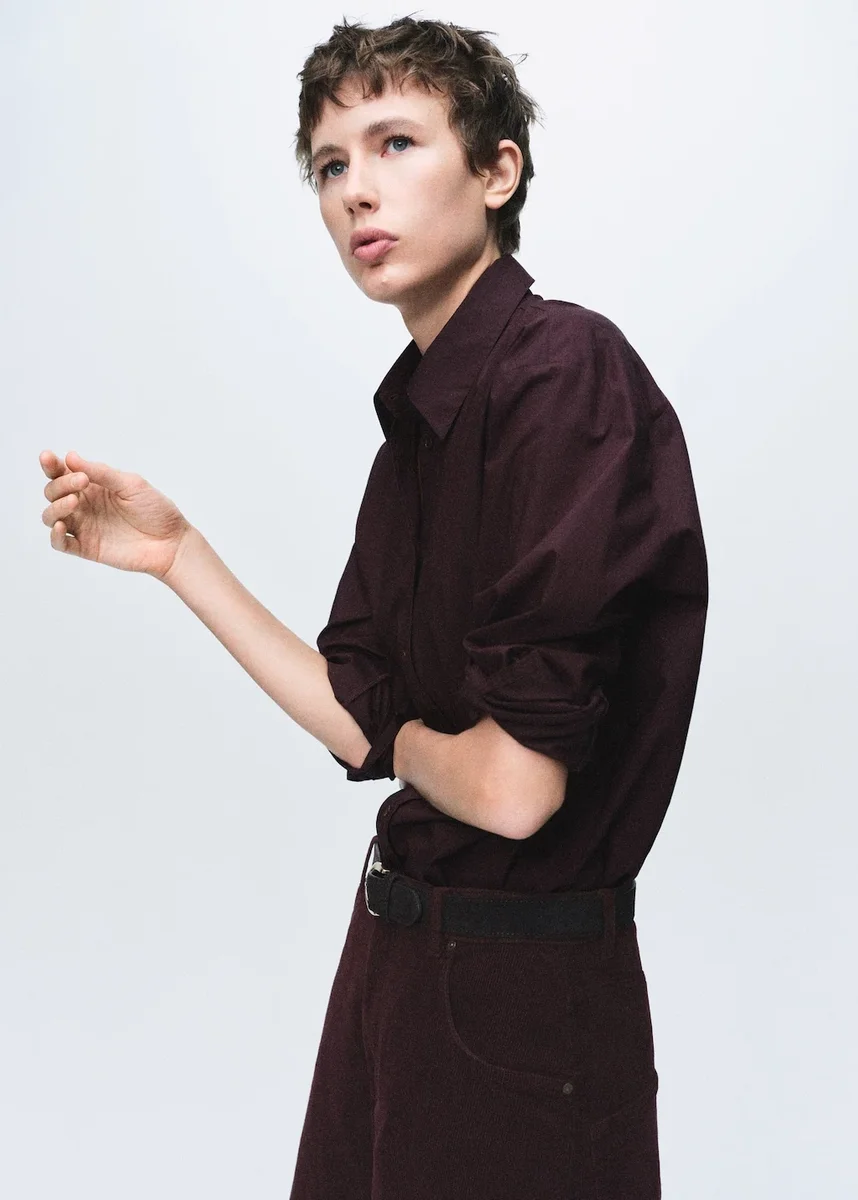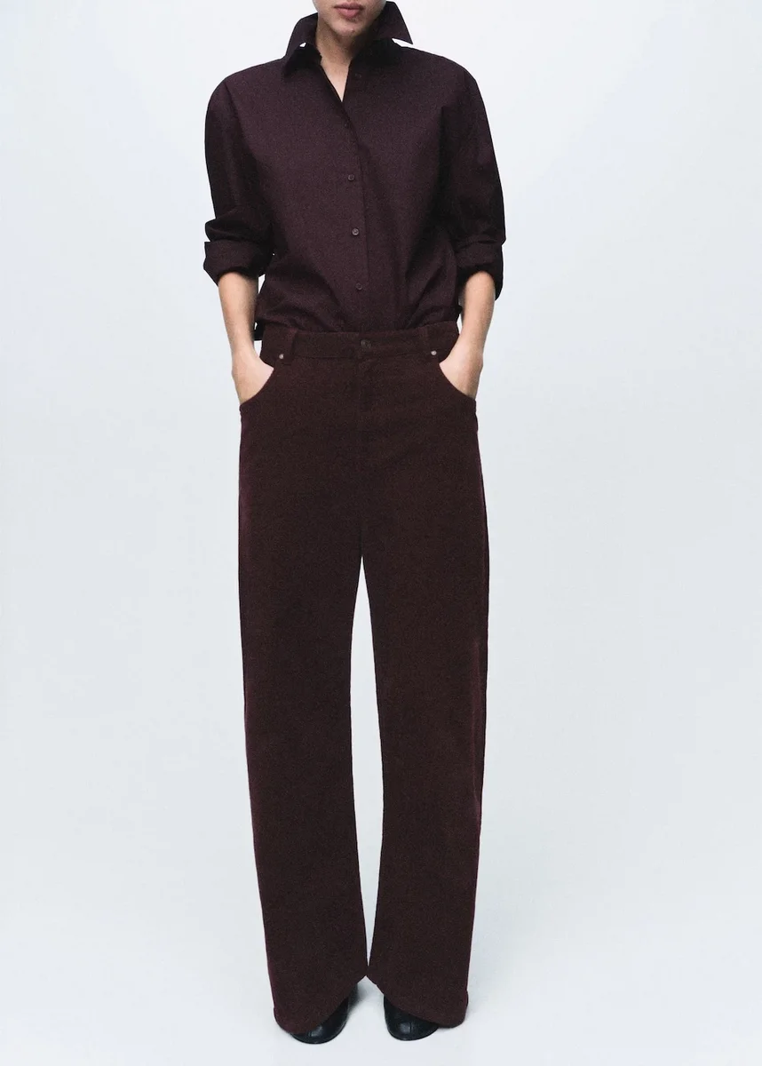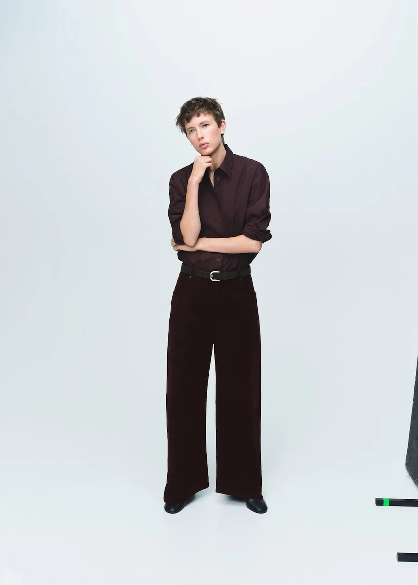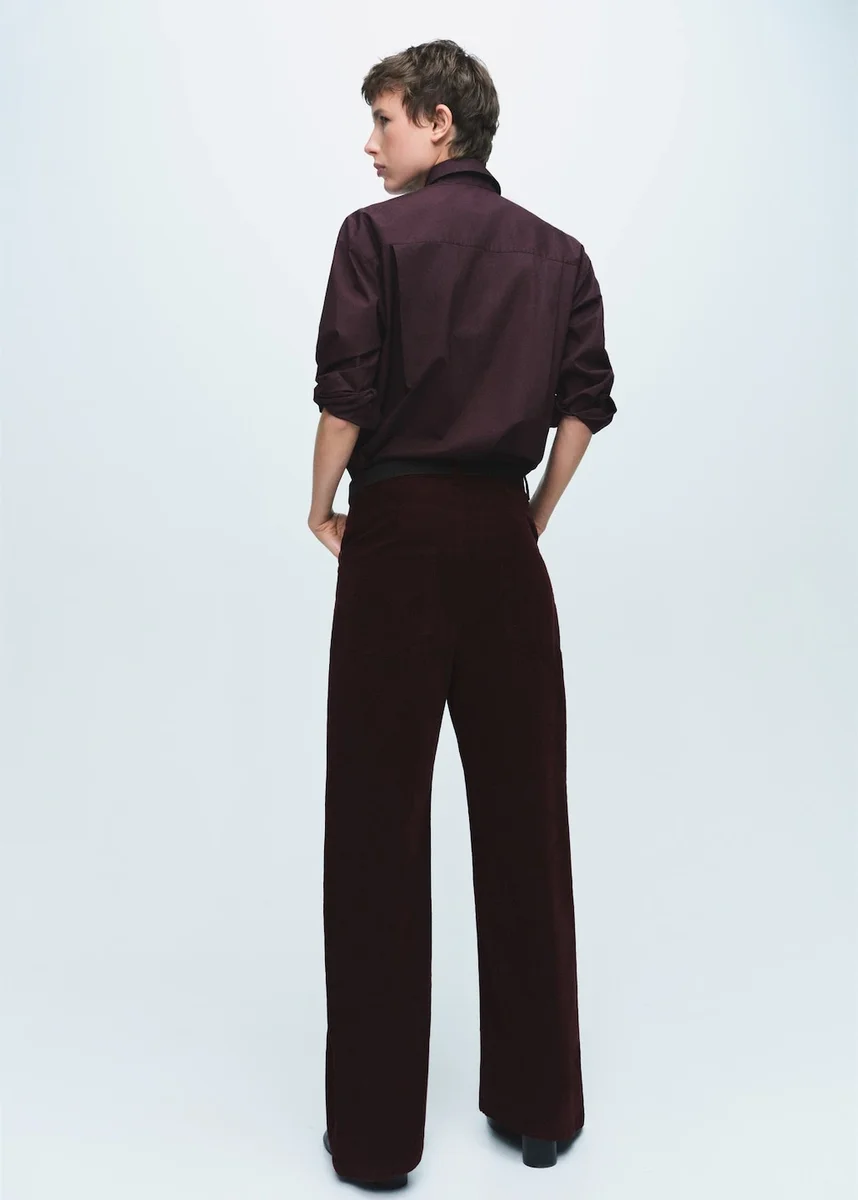 Manšestrová tkanina. Dlouhý střih. Široké nohavice. Nízký pas. Poutka na opasek. Pět kapes. Zapínání na knoflík a zip. Pohodlná tkanina s elasticitou.