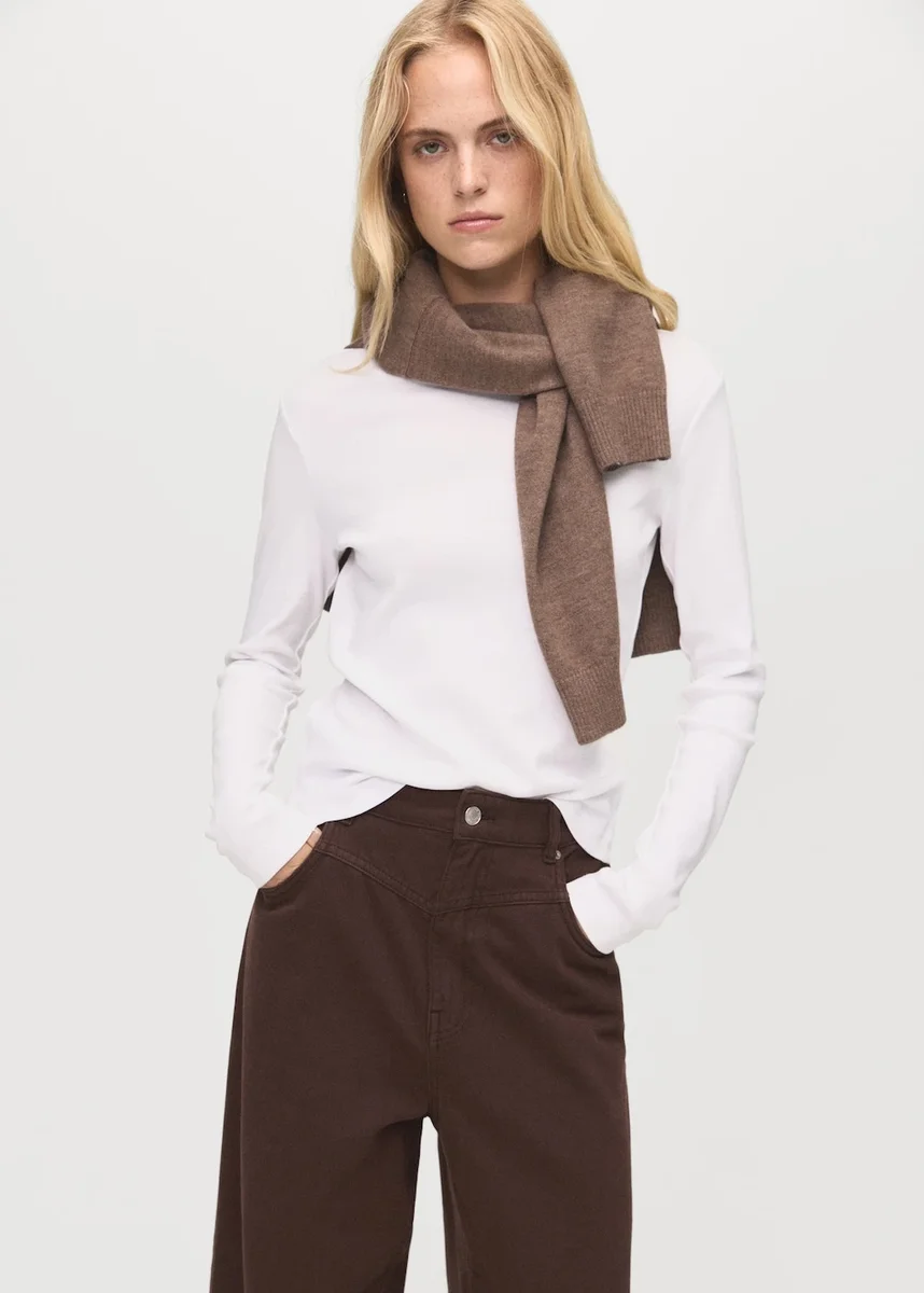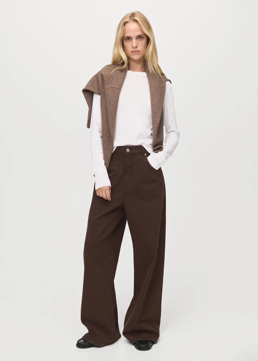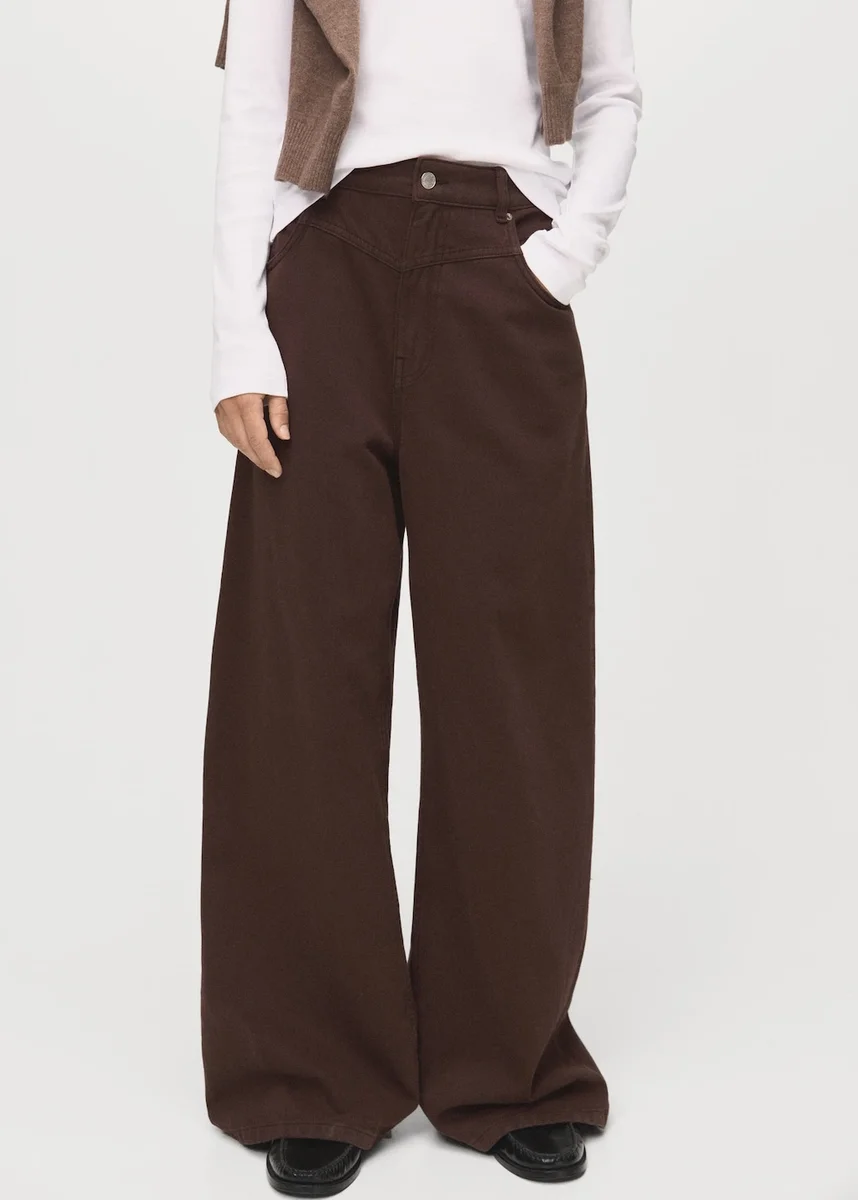 Bavlněná džínovina. Dlouhý střih. Široké nohavice. Volný střih. Středně vysoký pas. Poutka na opasek. Pět kapes. Detaily švů na bocích. Zapínání na zip a knoflík vpředu.