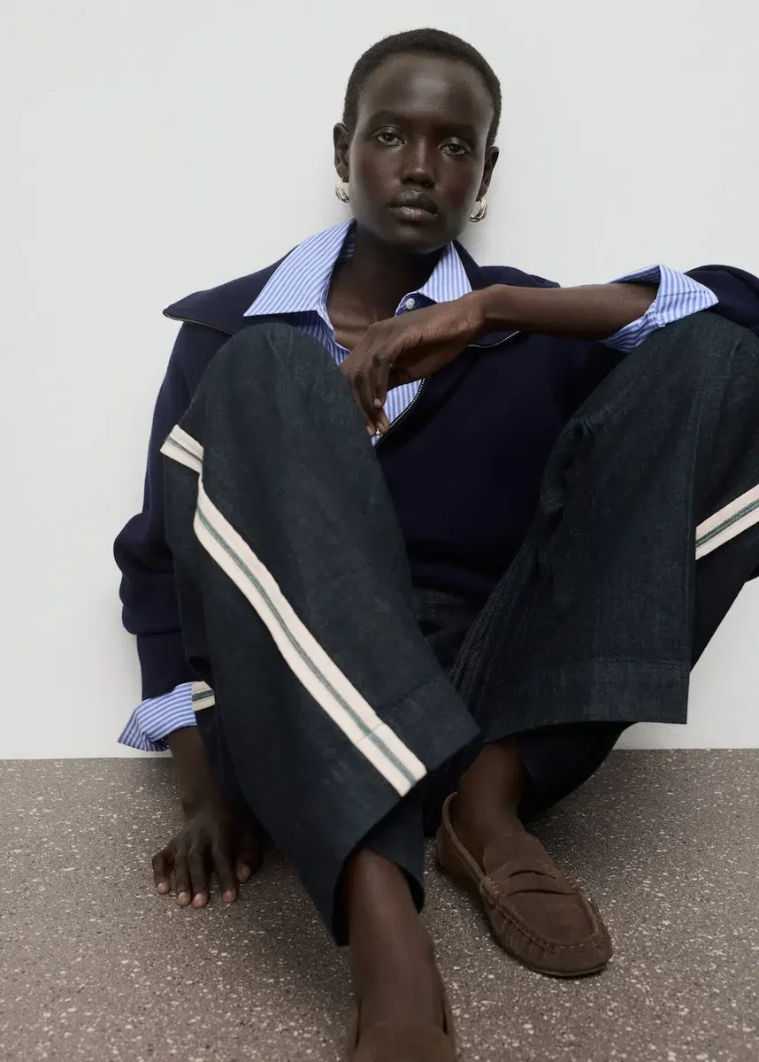 Bavlněná džínovina. Dlouhý střih. Široké nohavice. Nízký pas. Poutka na opasek. Boční pruhy. Skryté zapínání na knoflík, háček a zip. Vnitřní délka 81,7 cm.