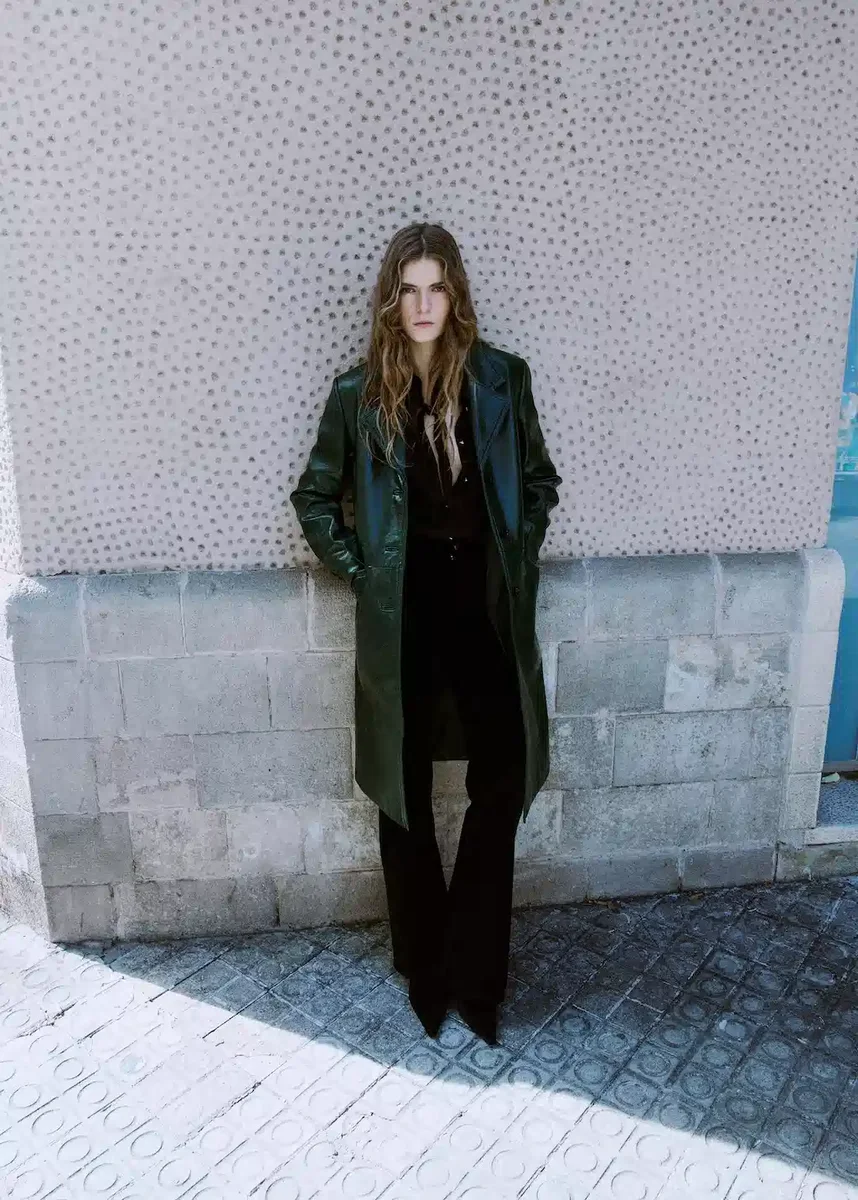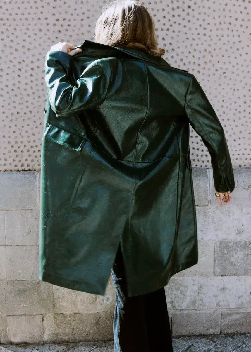 Tento dlouhý kabát rovného střihu je vyroben z umělé kůže a má elegantní výstřih do V s klopami. Má dlouhé rukávy, dvě přední kapsy s klopami a zapínání na knoflíky vpředu. Vnitřní podšívka