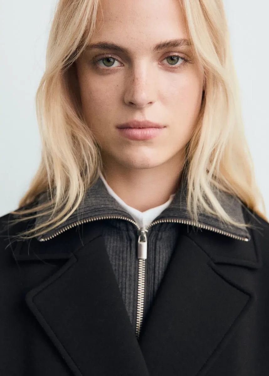 Tento kabát má dlouhý a rovný střih a kombinovaný styl s košilovým límcem a dlouhými rukávy. Má dvě boční kapsy a dvouřadé zapínání, stejně jako vnitřní podšívku. Složení: 79 % polyester, 14 % viskóza, 7 % elastan Podšívka: 44 % polyester, 32 % polyamid, 24 % bavlna Žebrování: 54 % polyester, 28 % bavlna, 18 % polyamid