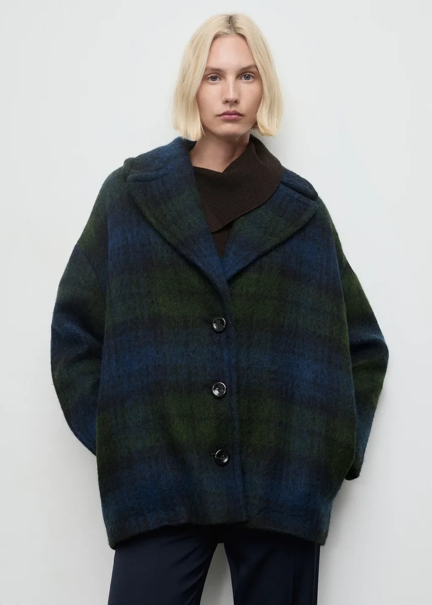 Tento kabát s oversized kostkovaným vzorem má klopový límec a výstřih do V. Má dlouhé rukávy, dvě boční kapsy a zapínání na knoflíky vpředu. Vnitřní podšívka