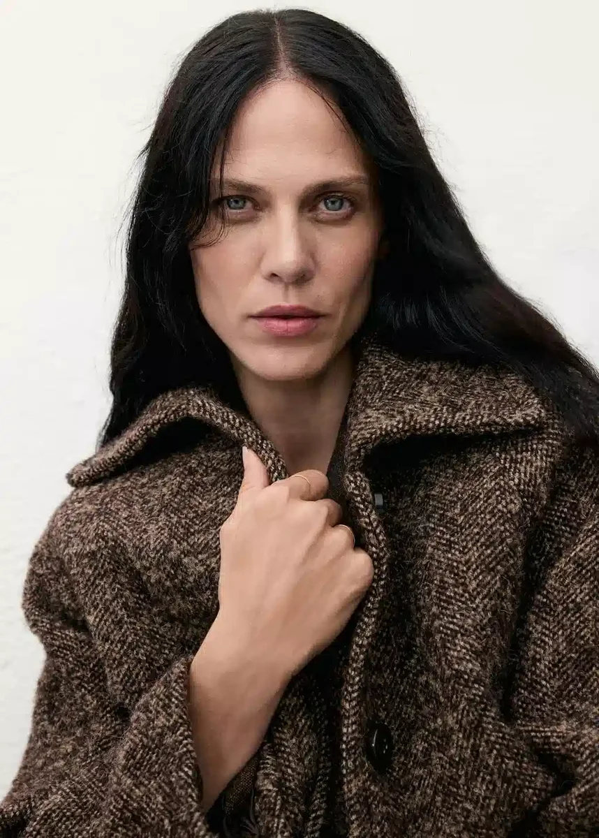 Tento oversized model je vyroben z melírované směsové vlny a má košilový límec a dlouhé rukávy. Má dvě přední kapsy s klopou, zapínání na knoflíky vpředu a vnitřní podšívku