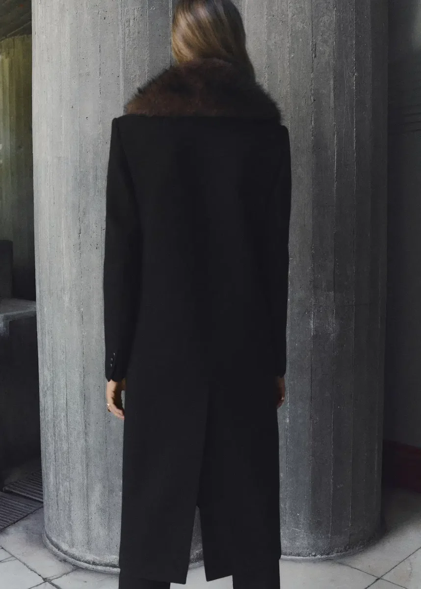 Směsová vlna. Dlouhý střih. Rovný střih. Límec s klopami a výstřihem do V. Odnímatelný límec s kožešinovým efektem. Dlouhé rukávy s manžetami na knoflíky. Dvě kapsy s klopami na přední straně. Zapínání na knoflíky vpředu. Vnitřní podšívka