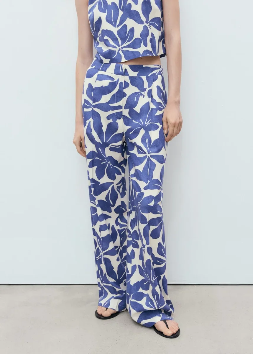 Dlouhý střih. Rovný střih. Květinový potisk. Středně vysoký pas. Detail švů. Dvě boční kapsy. Skryté zapínání na knoflík, háček a zip. Celkový vzhled.