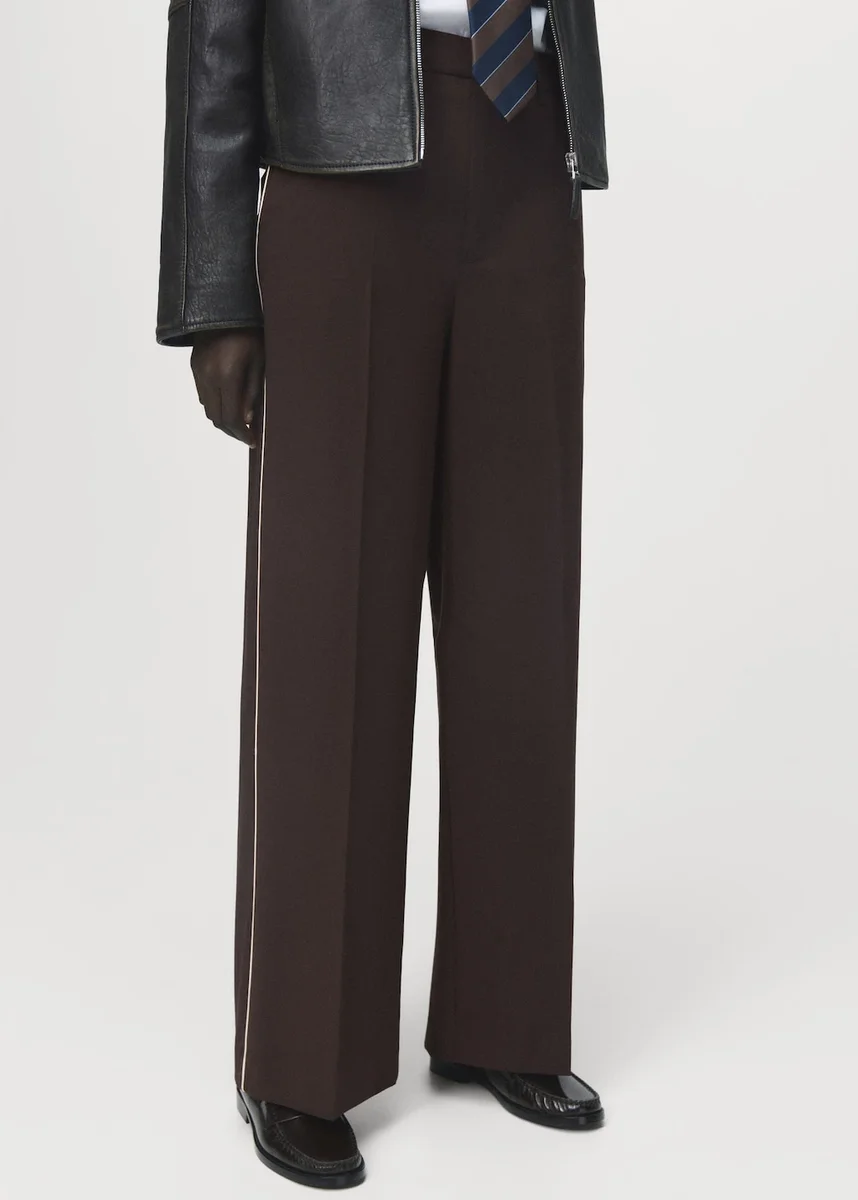 Dlouhý střih. Rovný střih. Středně vysoký pas. Poutka na opasek. Dvě boční kapsy. Zadní kapsa s lemováním. Boční pruhy. Skryté zapínání na knoflík, háček a zip. Vnitřní podšívka. Fialová barva je exkluzivně k dostání online.
