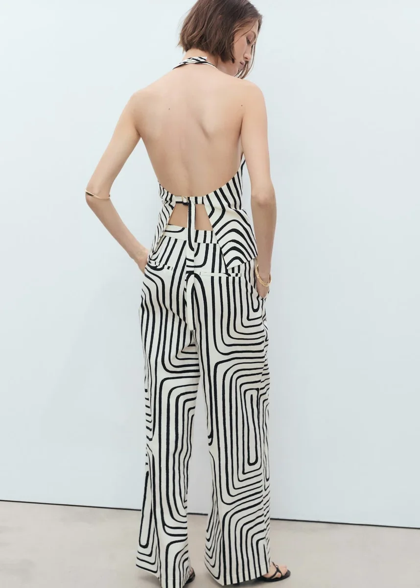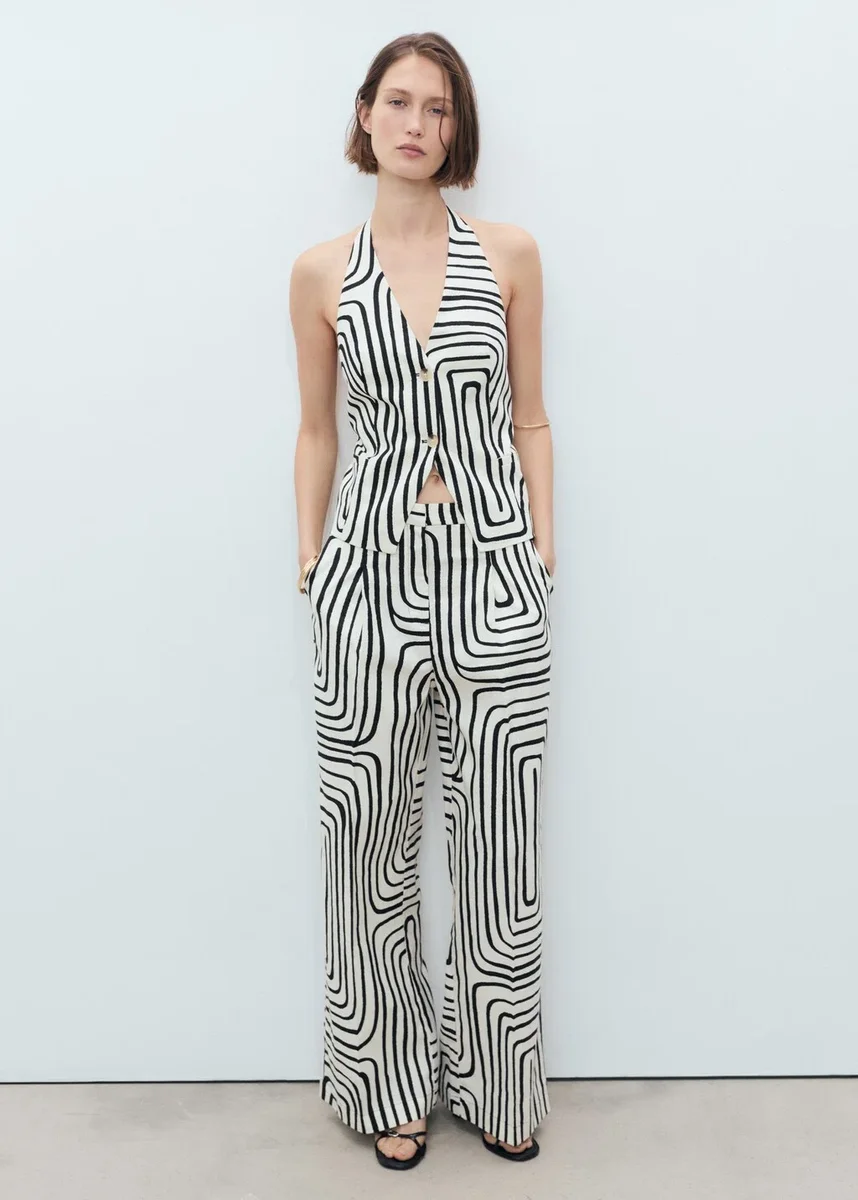 Směs bavlny a lnu. Dlouhý střih. Rovný střih. Geometrický potisk. Středně vysoký pas. Poutka na pásek. Nastavovací knoflíky po stranách. Dvě boční kapsy. Dvě zadní kapsy s lemováním. Skryté zapínání na knoflík, háček a zip. Kompletní look. Black Friday.