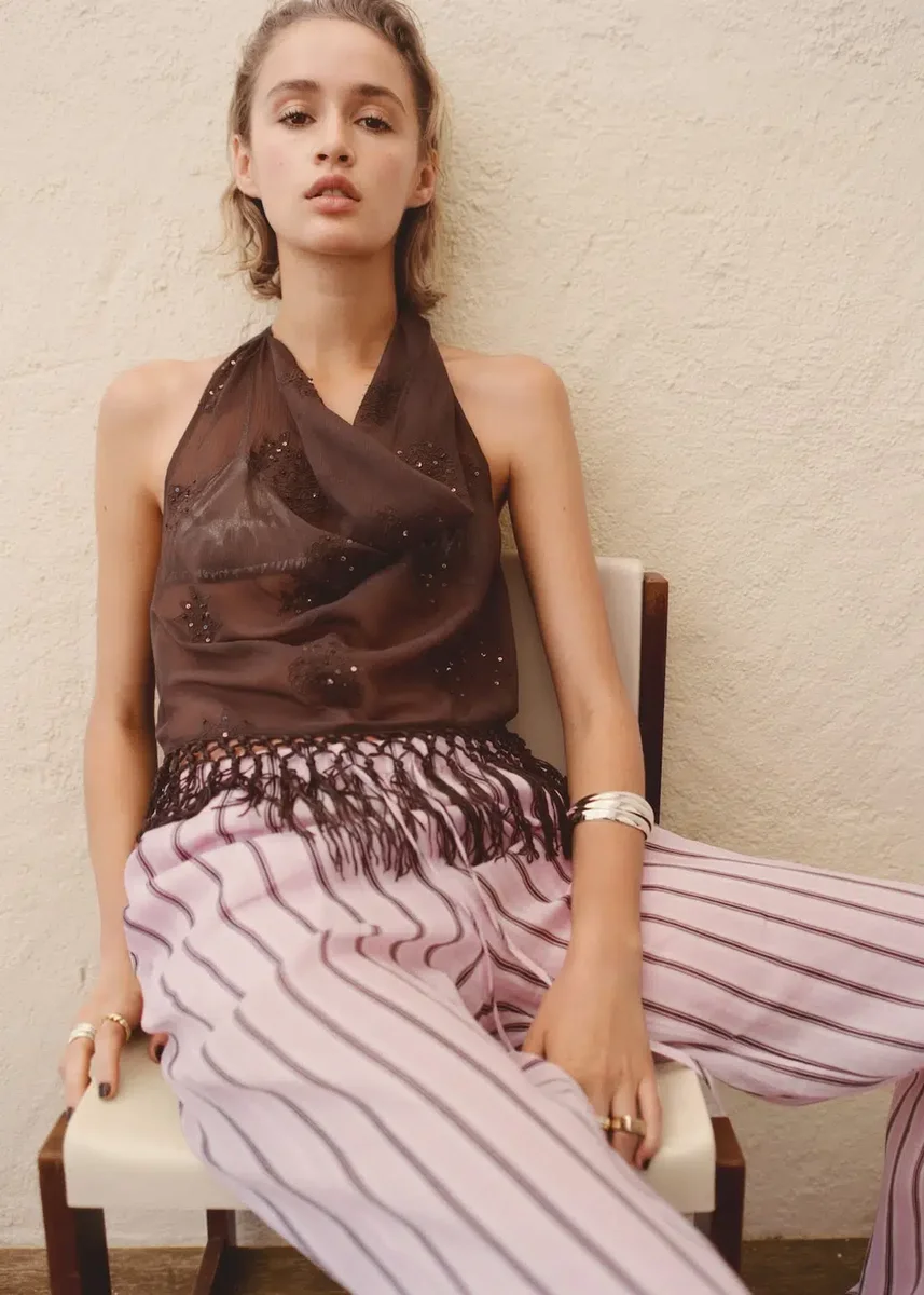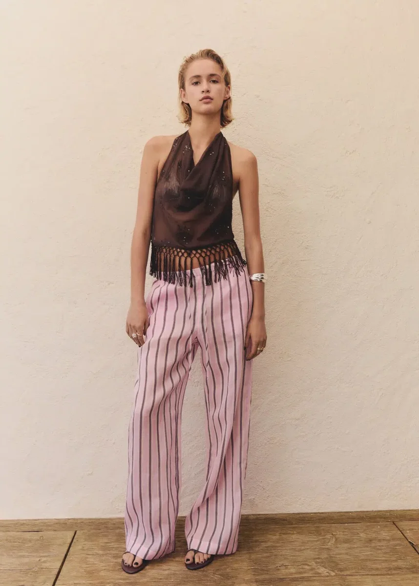 100% ramie. Dlouhý střih. Rovný střih. Pruhovaný vzor. Středně vysoký pas. Stahovací šňůrka v pase. Total look.