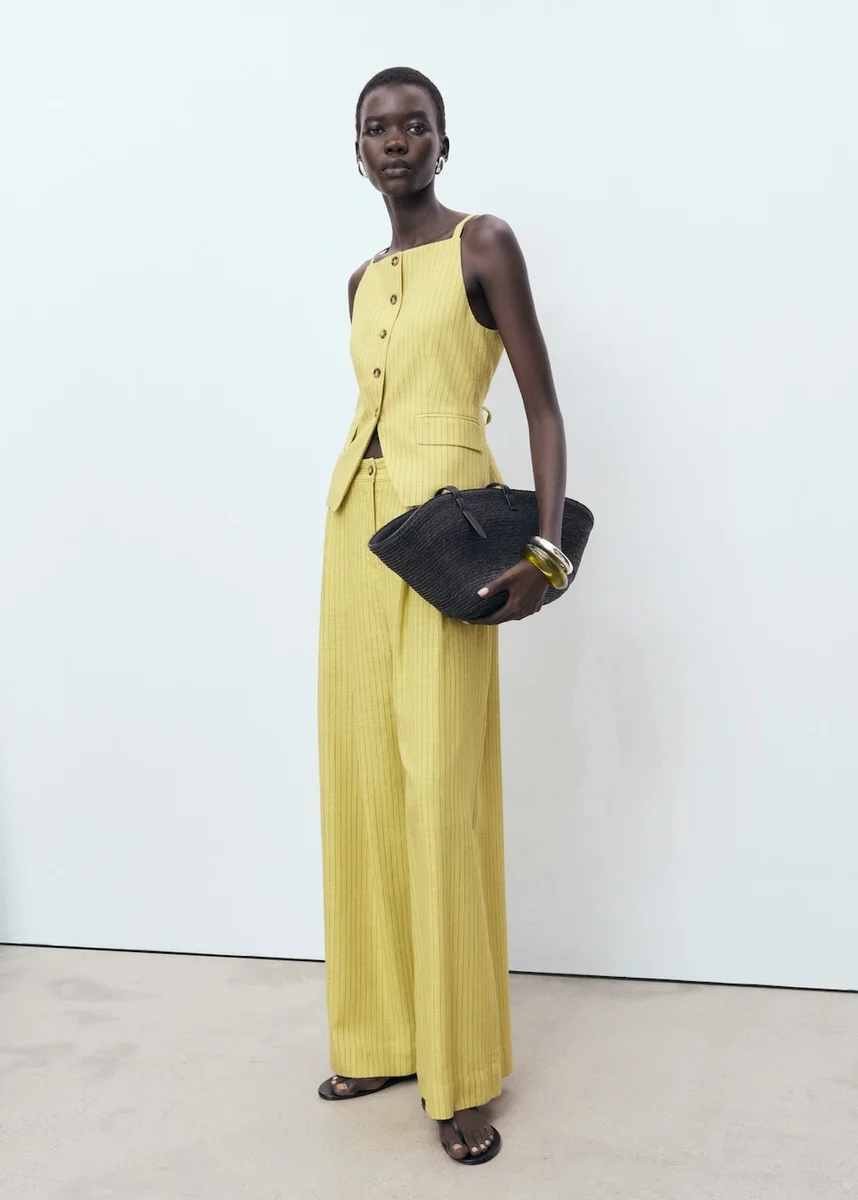 Směs lnu a lyocellu. Dlouhý střih. Rovný střih. Pruhovaný vzor. Vysoký pas. Detail švů. Dvě boční kapsy. Zapínání na knoflíky a zip. Celkový vzhled.