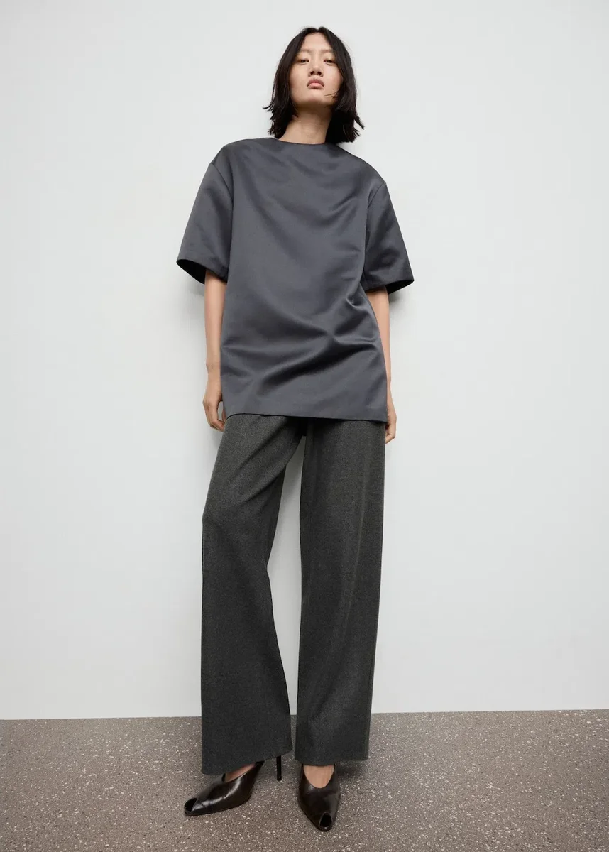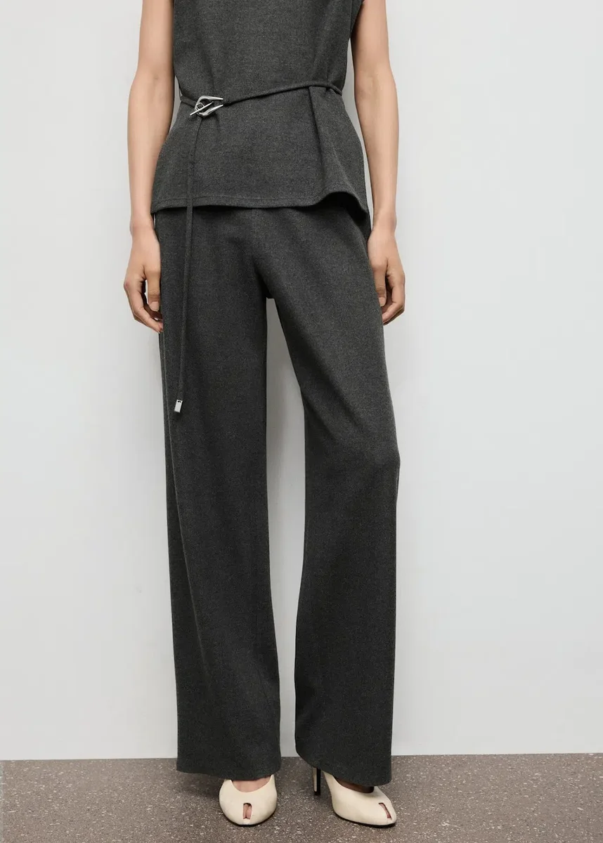 Dlouhý střih. Rovný střih. Středně vysoký pas. Elastický pas. Bez zapínání. Celkový vzhled.