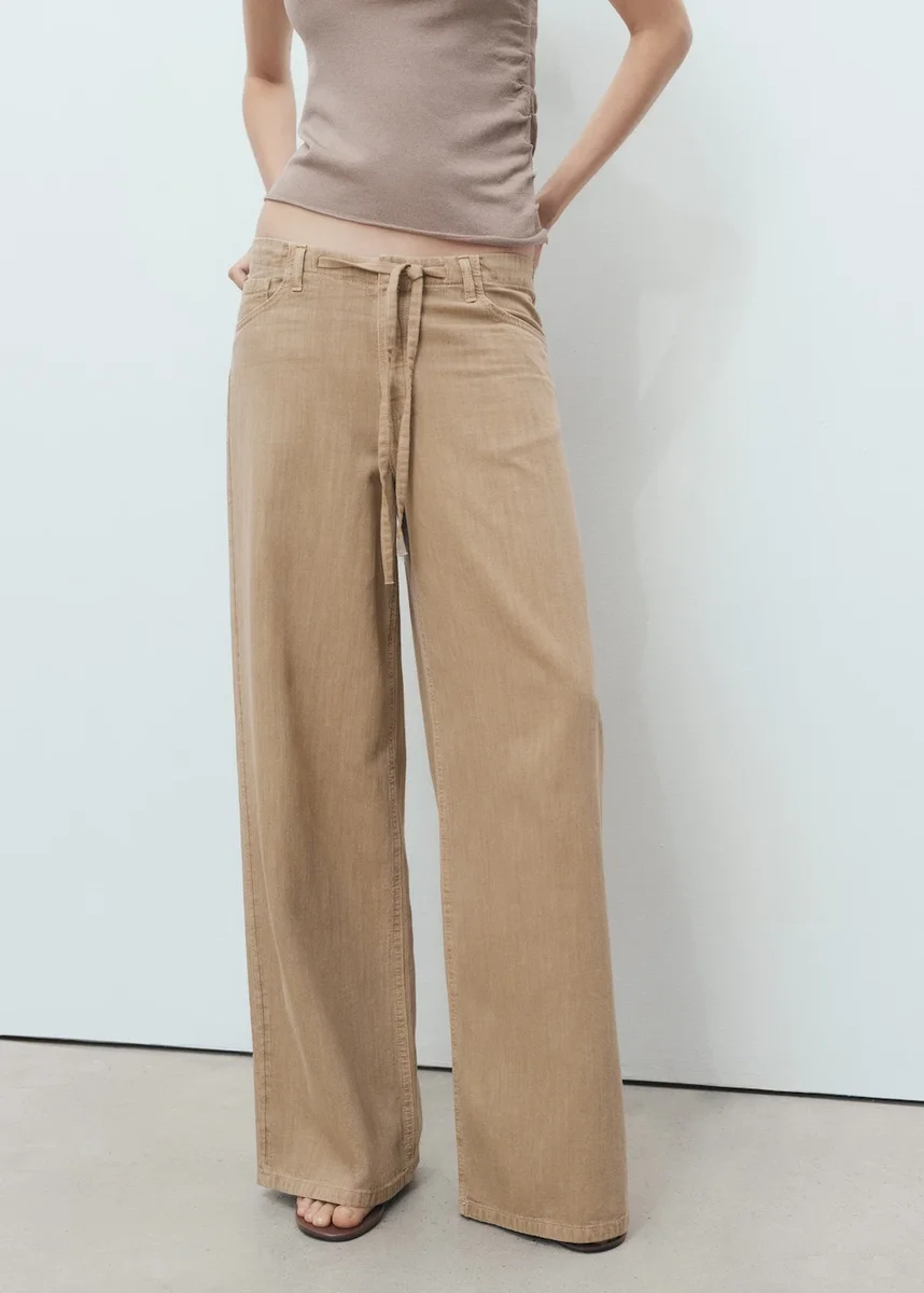 Směs bavlny a lnu. Dlouhý střih. Široké nohavice. Středně vysoký pas. Poutka na pásek. Nastavitelný pásek. Pět kapes. Zapínání na háček a zip. Vnitřní podšívka. Vnitřní délka 79,5 cm.