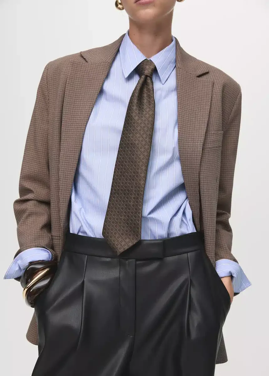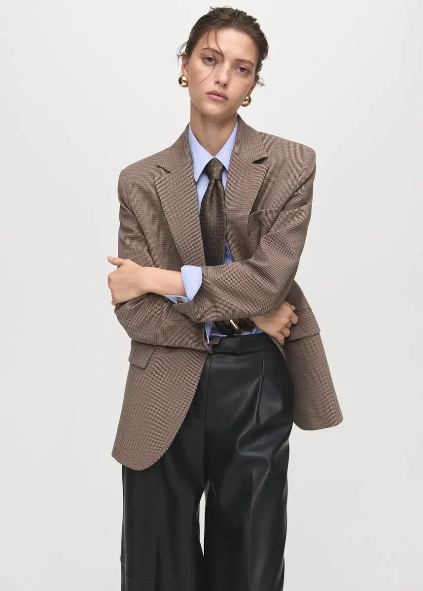 Kožený efekt. Dlouhý střih. Široké nohavice. Střední výška pasu. Dvě boční kapsy. Přední záhyb. Skryté zapínání na knoflík, háček a zip s légou. Vnitřní podšívka.