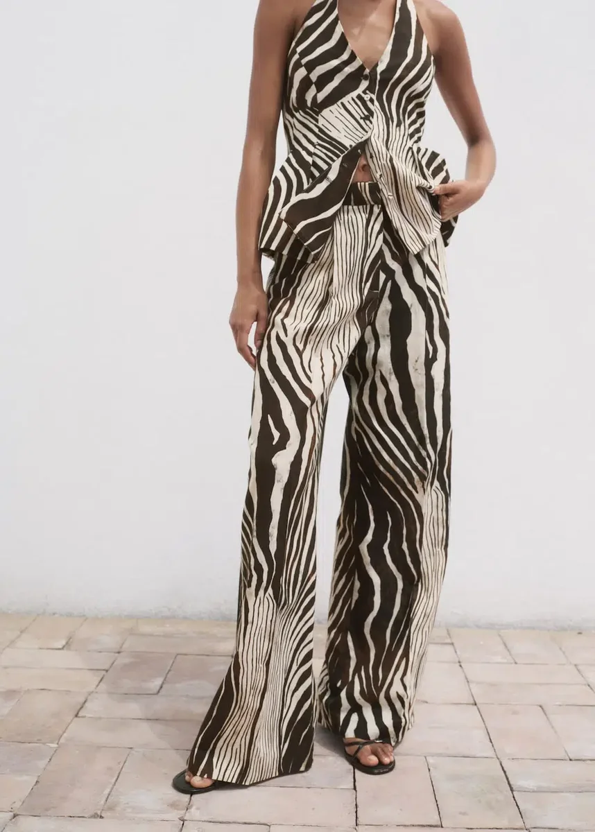 Směs lnu a bavlny. Dlouhý střih. Široké nohavice. Zebrový potisk. Středně vysoký pas. Poutka na opasek. Dvě boční kapsy. Skryté zapínání na knoflík, háček a zip. Podšívka ze 100% bavlny. Celkový vzhled.