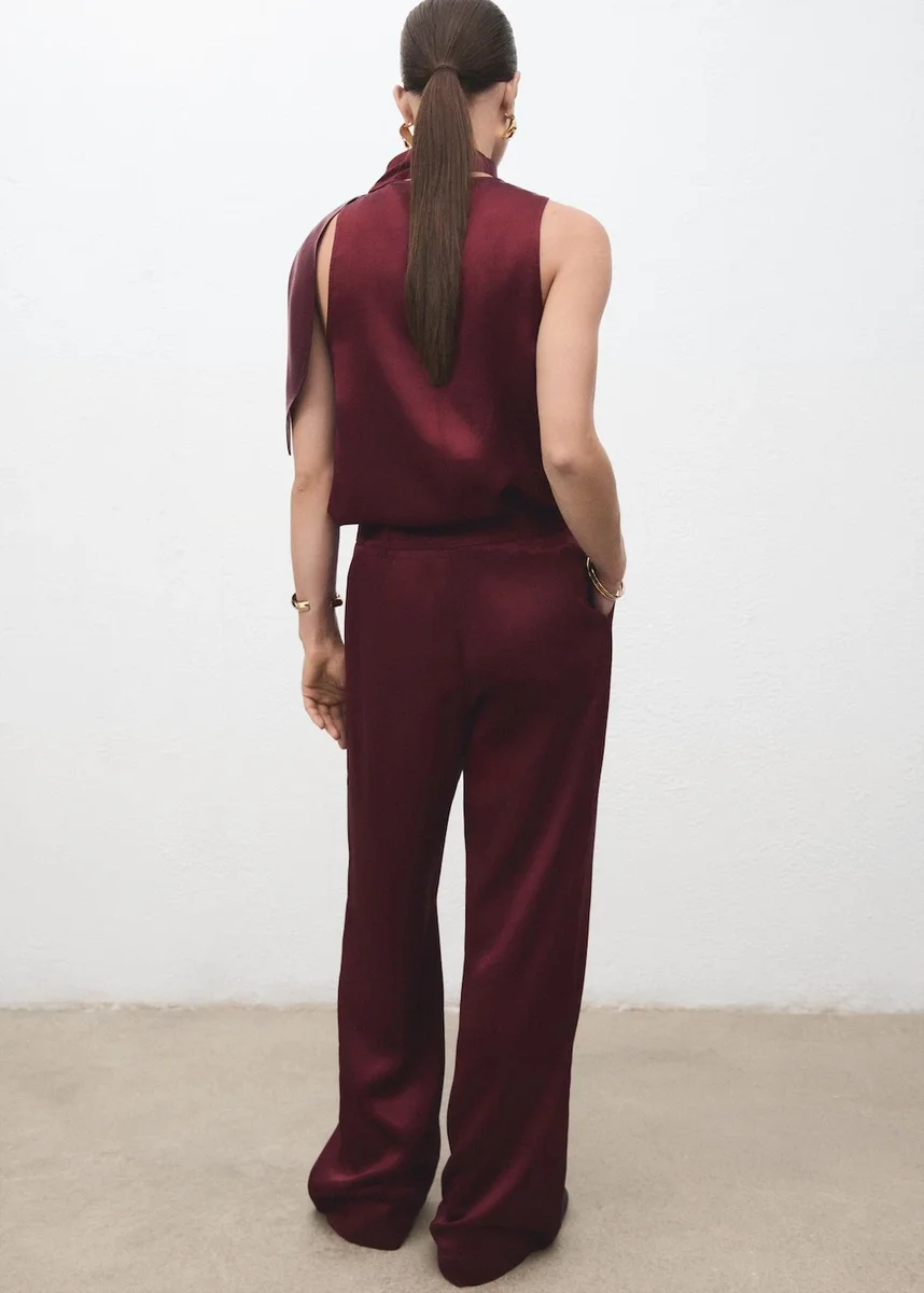 Saténová tkanina. Dlouhý střih. Široké nohavice. Středně vysoký pas. Poutka na pásek. Přední záhyb. Dvě boční kapsy. Skryté zapínání na knoflík, háček a zip. Vnitřní podšívka. Kompletní look.