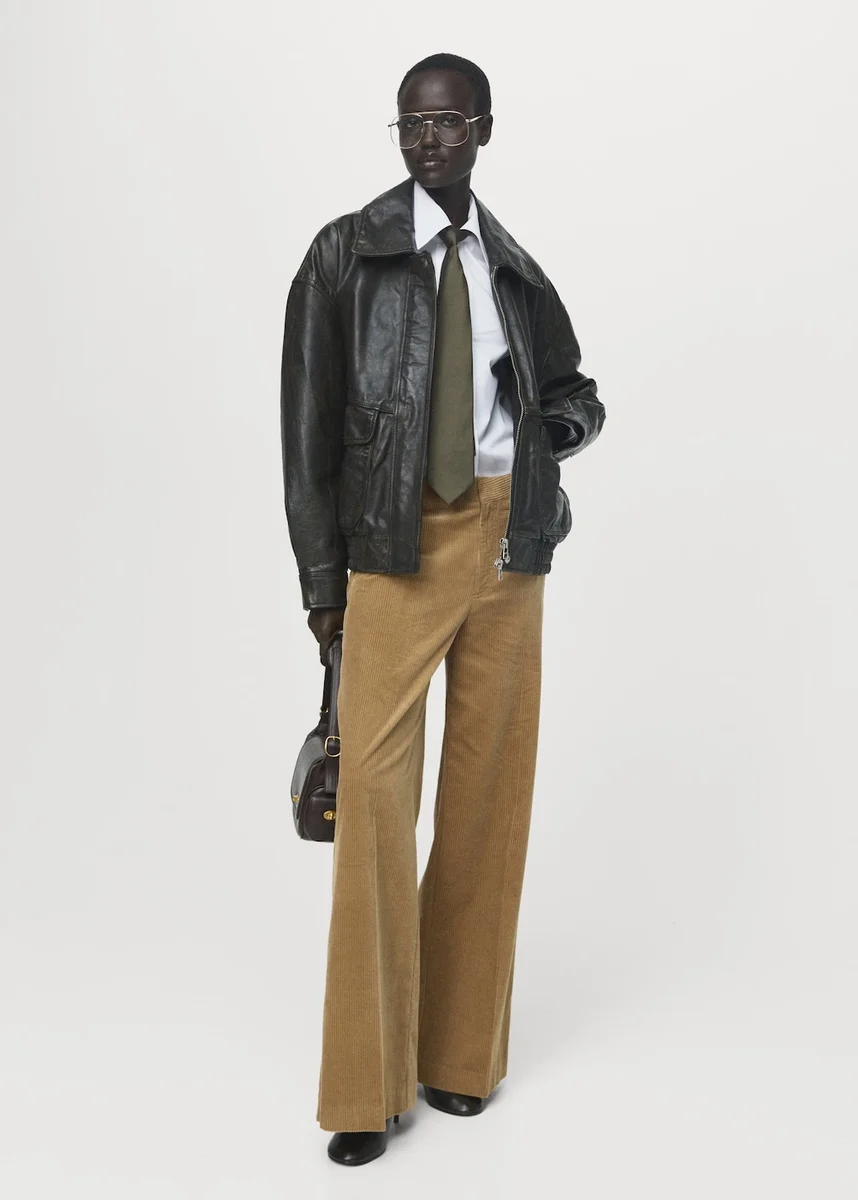 Manšestrová tkanina. Dlouhý střih. Široké nohavice. Nízký pas. Poutka na opasek. Dvě boční kapsy. Dvě zadní kapsy s lemováním. Skryté zapínání na knoflík, háček a zip. Podšívka ze 100% bavlny