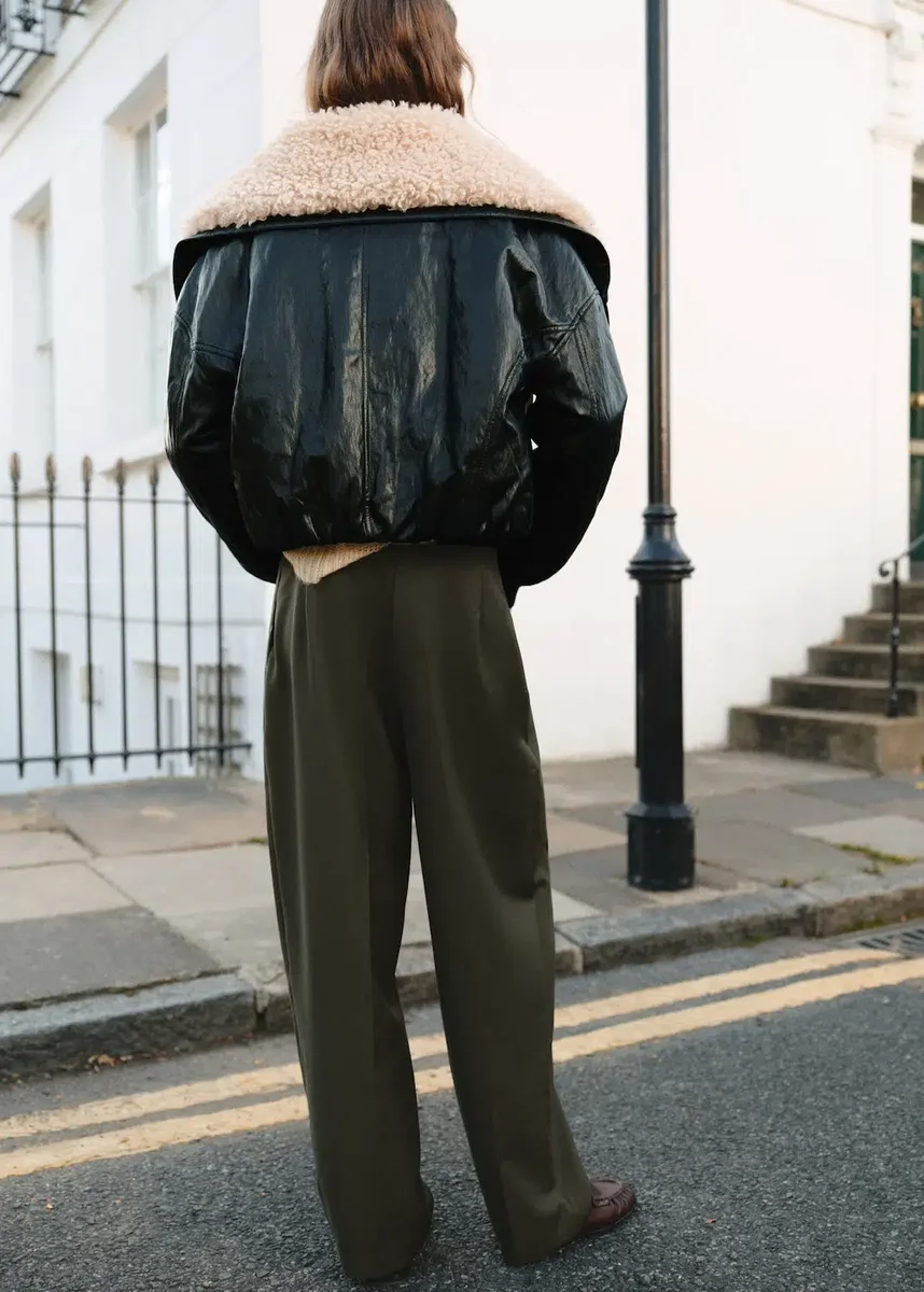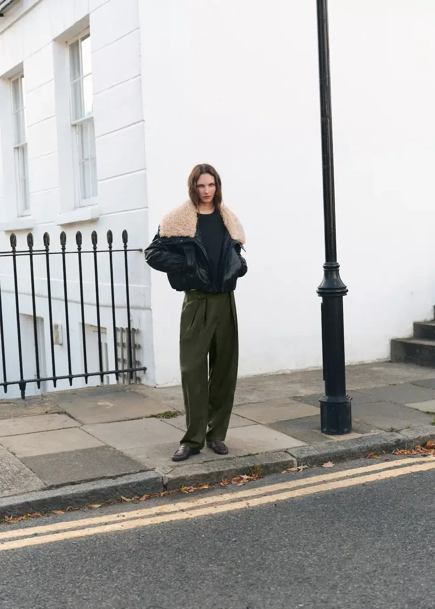 Dlouhý střih. Střih do zvonu. Střední výška pasu. Poutka na opasek. Ozdobný knoflík. Přední záhyb. Skryté zapínání na knoflík, háček a zip. Vnitřní podšívka