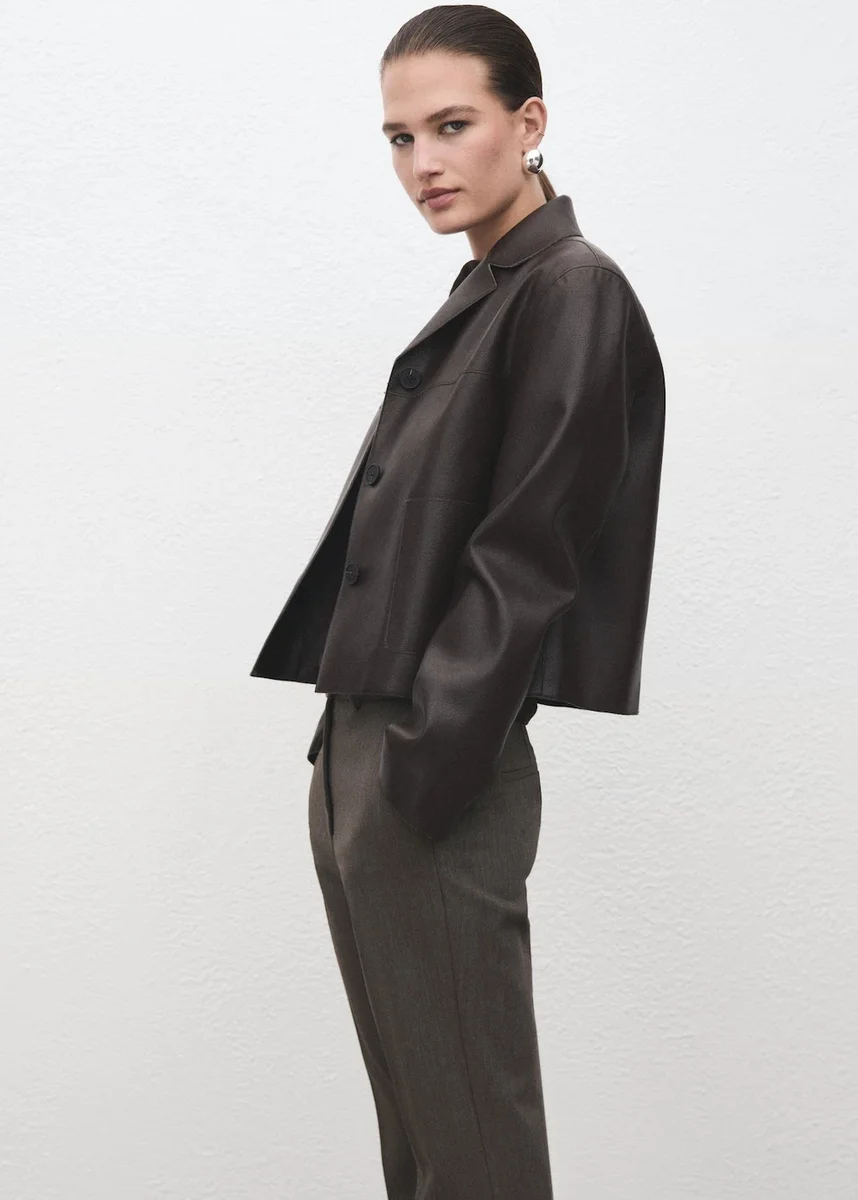 Dlouhý střih. Rozšířený střih. Středně vysoký pas. Poutka na opasek. Dvě boční kapsy. Skrytý knoflík, háček a zip vpředu s légou. Vnitřní podšívka