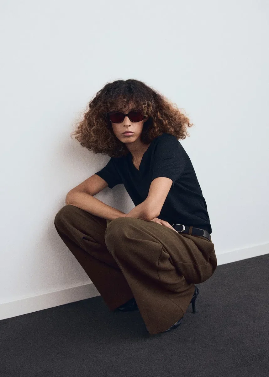 Dlouhý střih. Rovný střih. Střední výška pasu. Ozdobný pásek. Dvě boční kapsy. Detail švů. Skryté zapínání na knoflík, háček a zip.