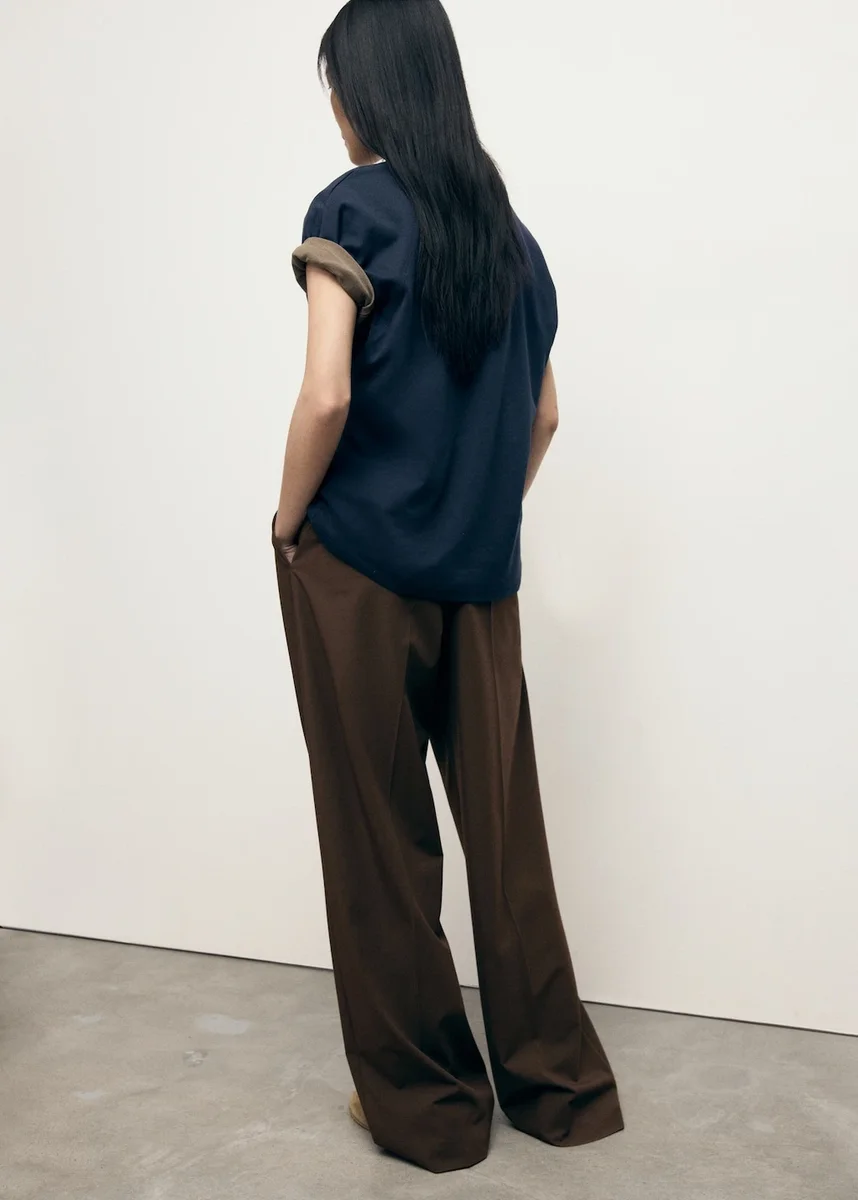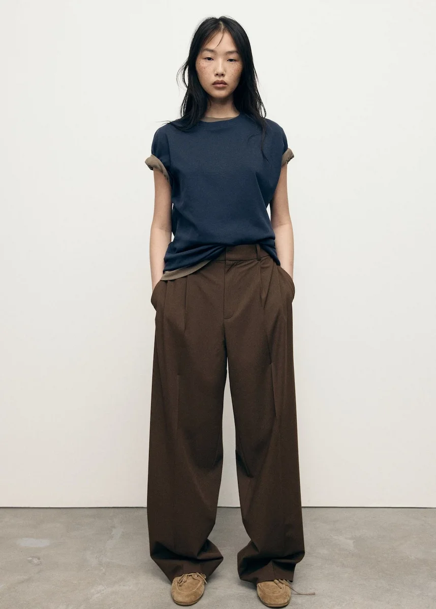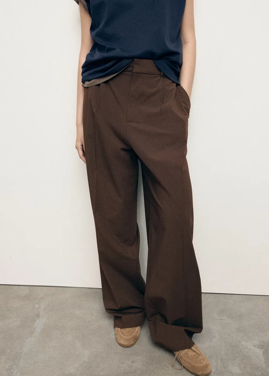 Dlouhý střih. Široké nohavice. Nízký pas. Poutka na pásek. Dvě boční kapsy. Dvě kapsy s knoflíkem vzadu. Detail švů. Skryté zapínání na knoflík, háček a zip. Vnitřní podšívka. K dispozici v nadměrných velikostech