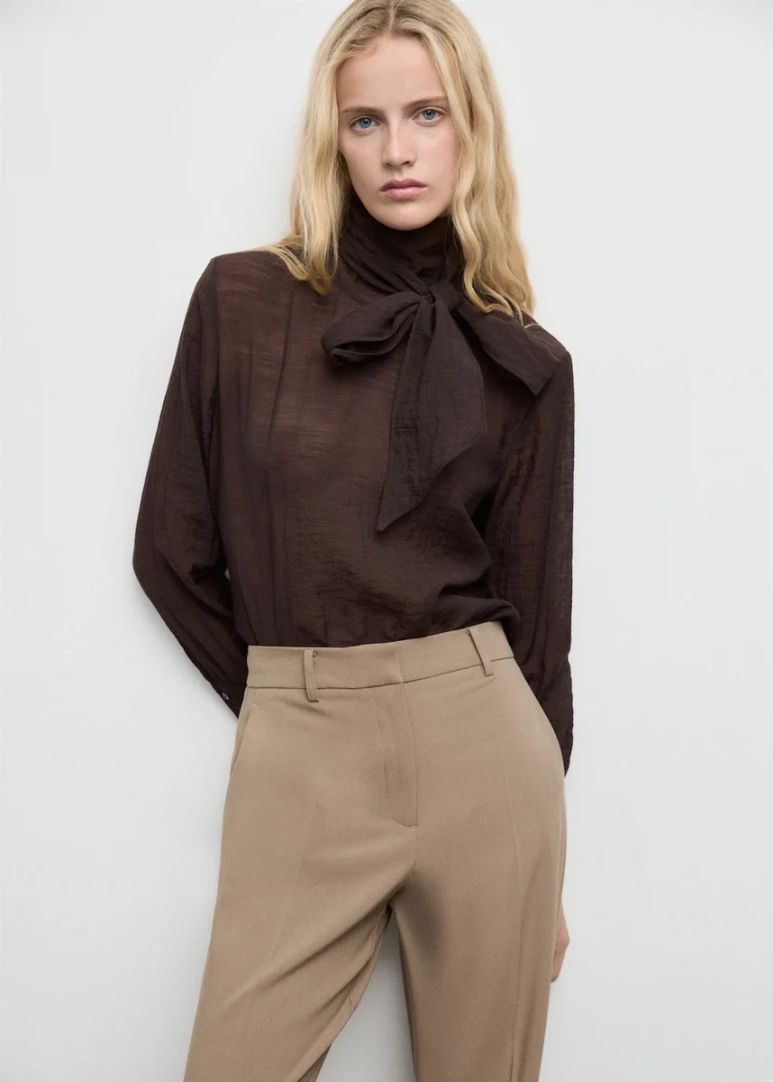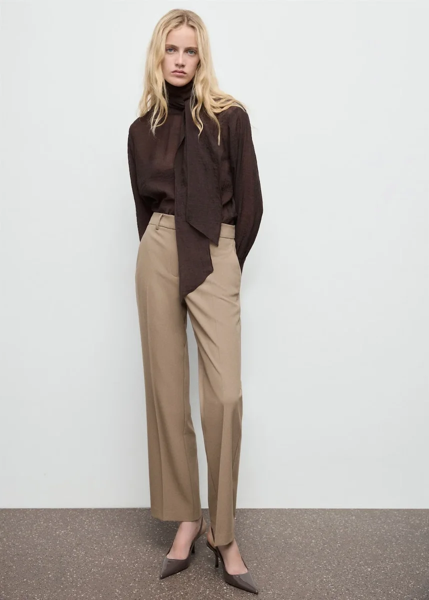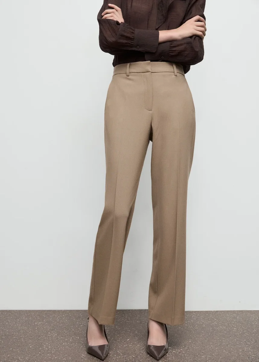 Lehká tkanina. Rovný střih. Dlouhý střih. Středně vysoký pas. Dvě boční kapsy. Zapínání na zip, knoflík a skryté suché zipy s légou. Poutka na opasek. Vnitřní podšívka.