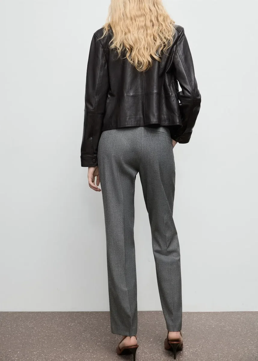 Lehká tkanina. Rovný střih. Dlouhý střih. Středně vysoký pas. Dvě boční kapsy. Zapínání na zip, knoflík a skryté suché zipy s légou. Poutka na opasek. Vnitřní podšívka.
