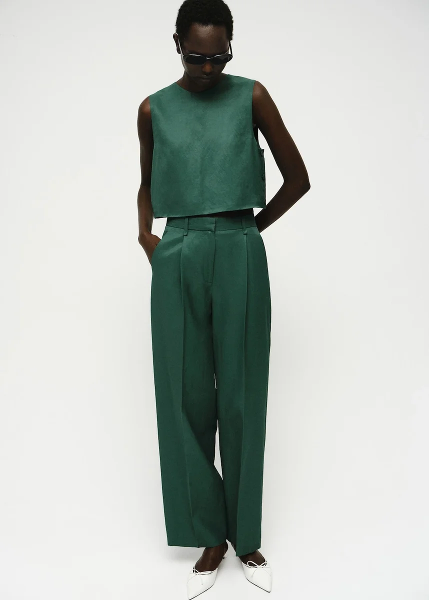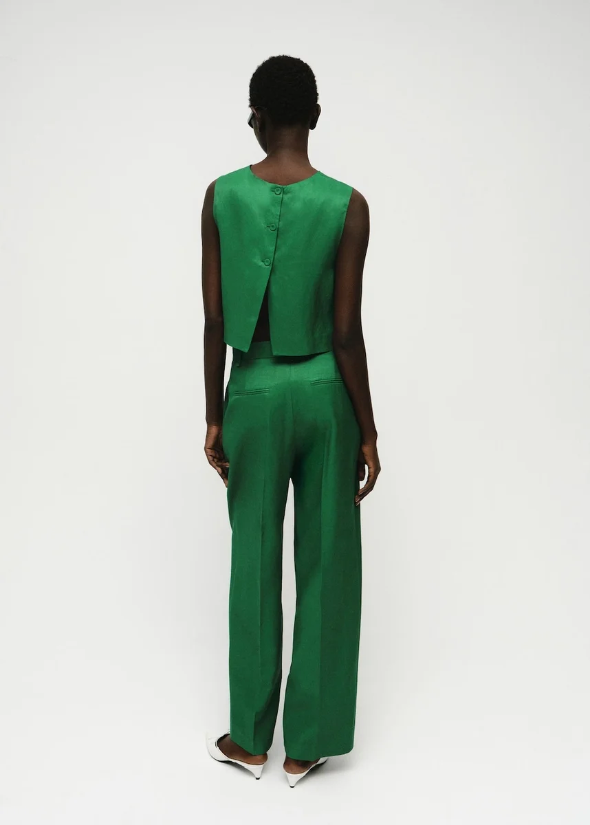 Směsová tkanina. Saténový povrch. Dlouhý střih. Rovný střih. Středně vysoký pas. Poutka na opasek. Dvě boční kapsy. Dvě zadní kapsy s lemováním. Přední záhyb. Skryté zapínání na knoflík, háček a zip. Vnitřní podšívka. Celkový vzhled. Tento oděv je součástí naší kolekce pro zvláštní příležitosti, která je navržena tak, abyste byli dokonalým hostem na jakékoli párty, svatbě nebo slavnosti.