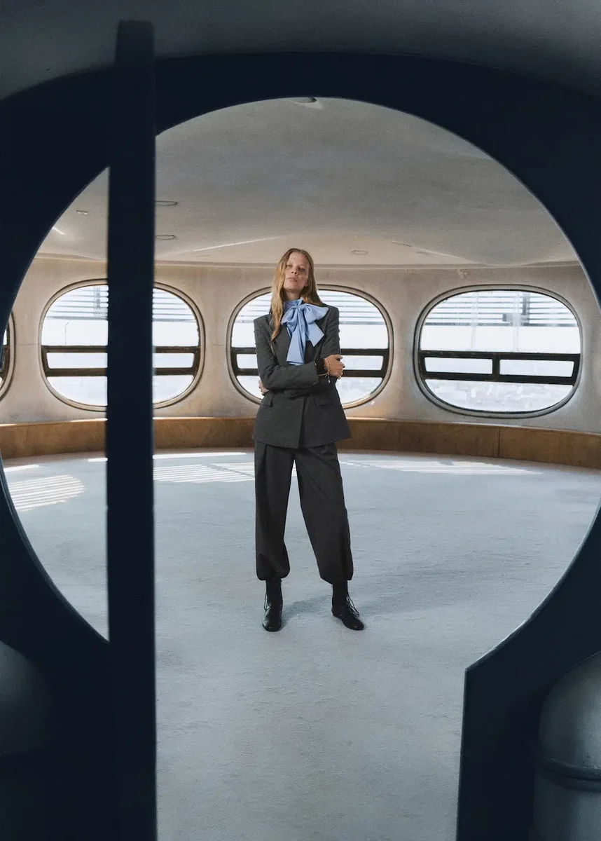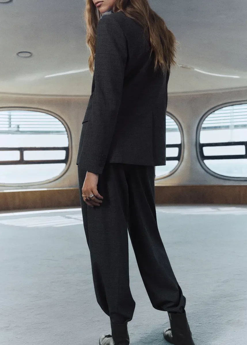 Kostýmový styl. Dlouhý střih. Rovný střih. Kostkovaný vzor. Středně vysoký pas. Poutka na opasek. Detail švů. Dvě boční kapsy. Zip, knoflík a skrytý suchý zip s légou. Vnitřní podšívka. Celkový vzhled