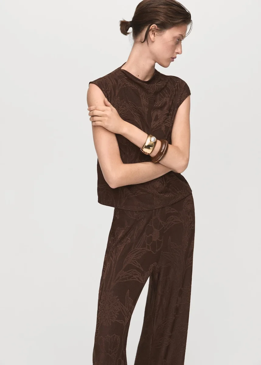 Plynoucí žakárová tkanina. Dlouhý střih. Rovný střih. Středně vysoký pas. Elastický pas. Bez zapínání. Celkový vzhled.