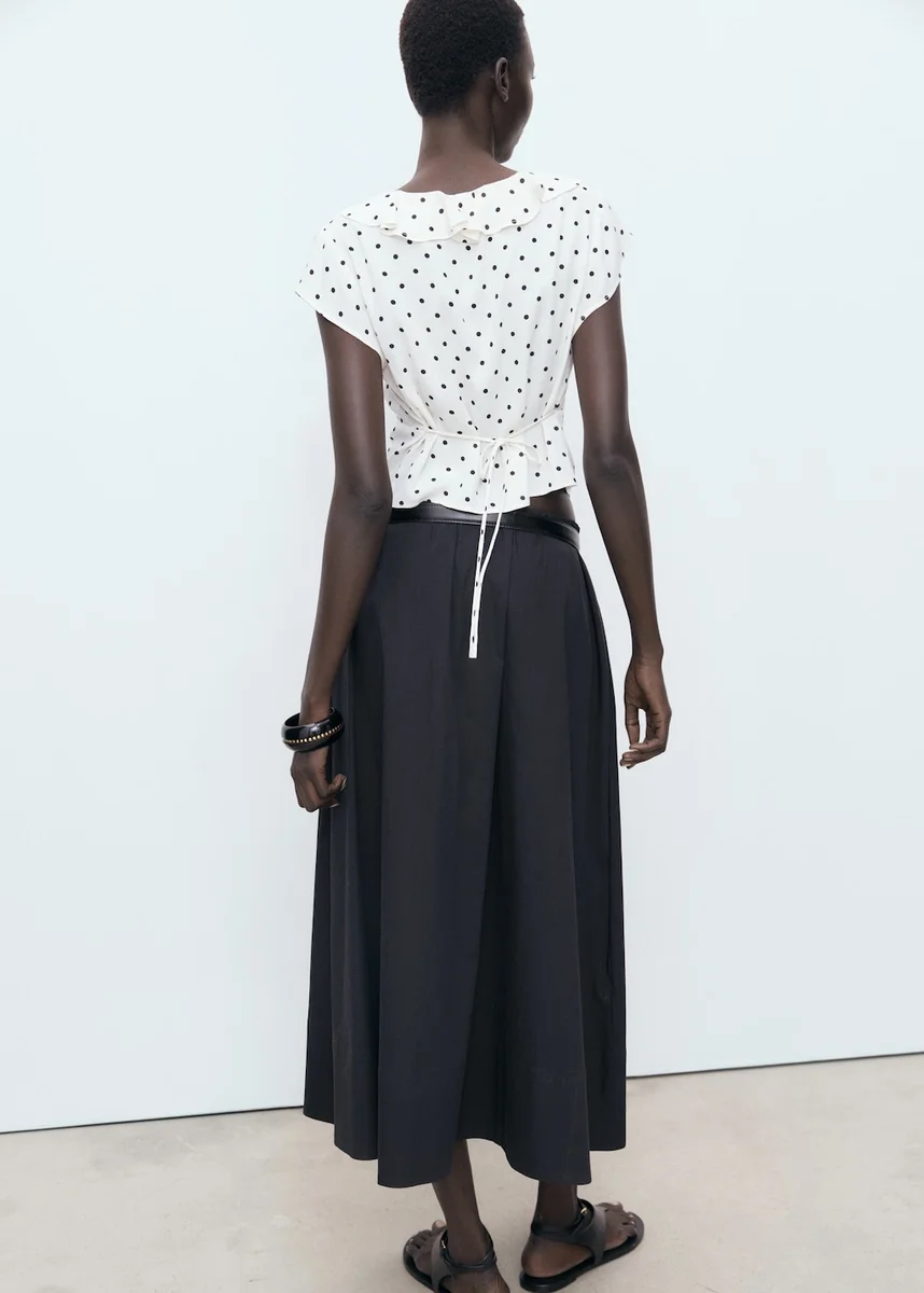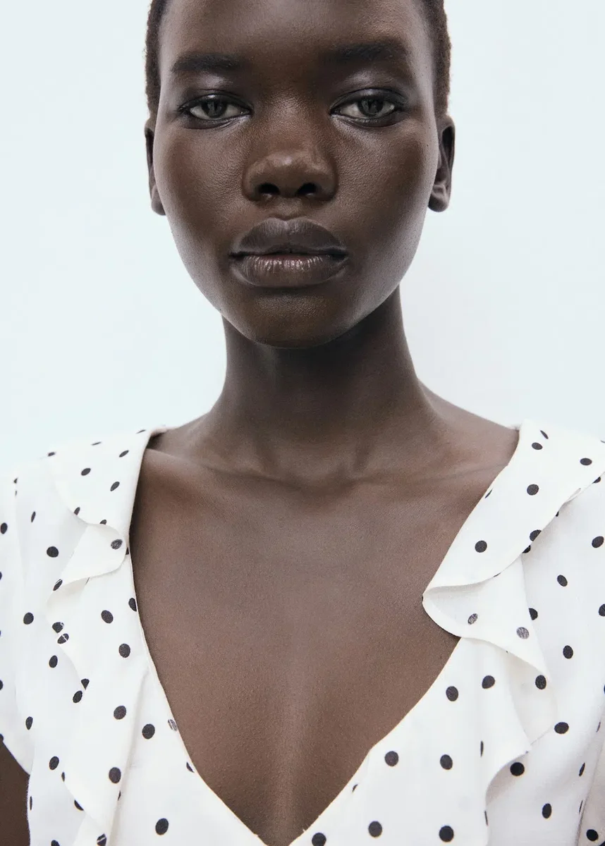 Tato puntíkovaná halenka s krátkým a přiléhavým střihem zvýrazňuje siluetu. Výstřih do V s volánky dodává modelu jedinečný nádech. Vzadu je opatřena nastavitelnou stuhou. Spárujte ji s ladící sukní a vytvořte kompletní look.