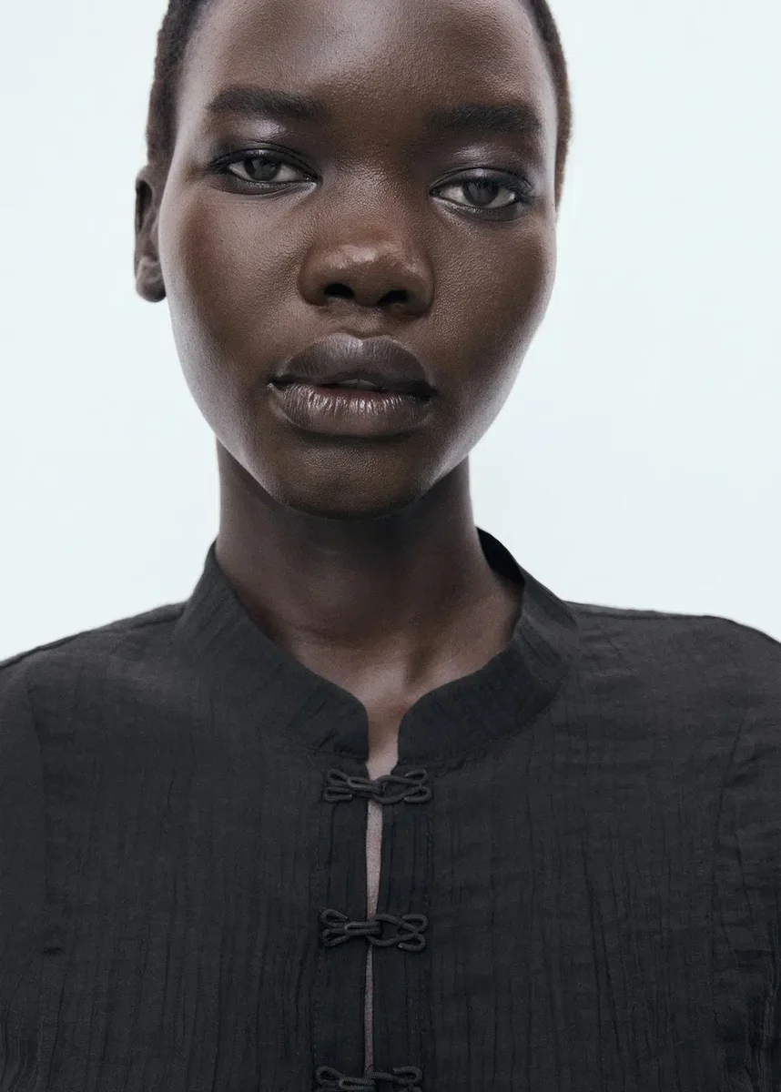 Tato lyocellová halenka s jemně zvrásněnou texturou a knoflíky ve stylu toggle kombinuje sofistikovanost a modernost. Límec a rovný střih z ní dělají univerzální a nadčasový kousek, který je ideální pro ty, kdo hledají rafinovaný a osobitý styl.