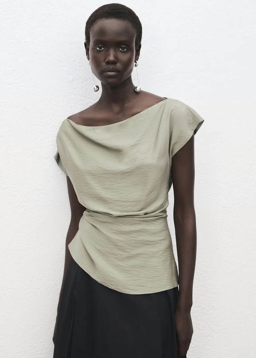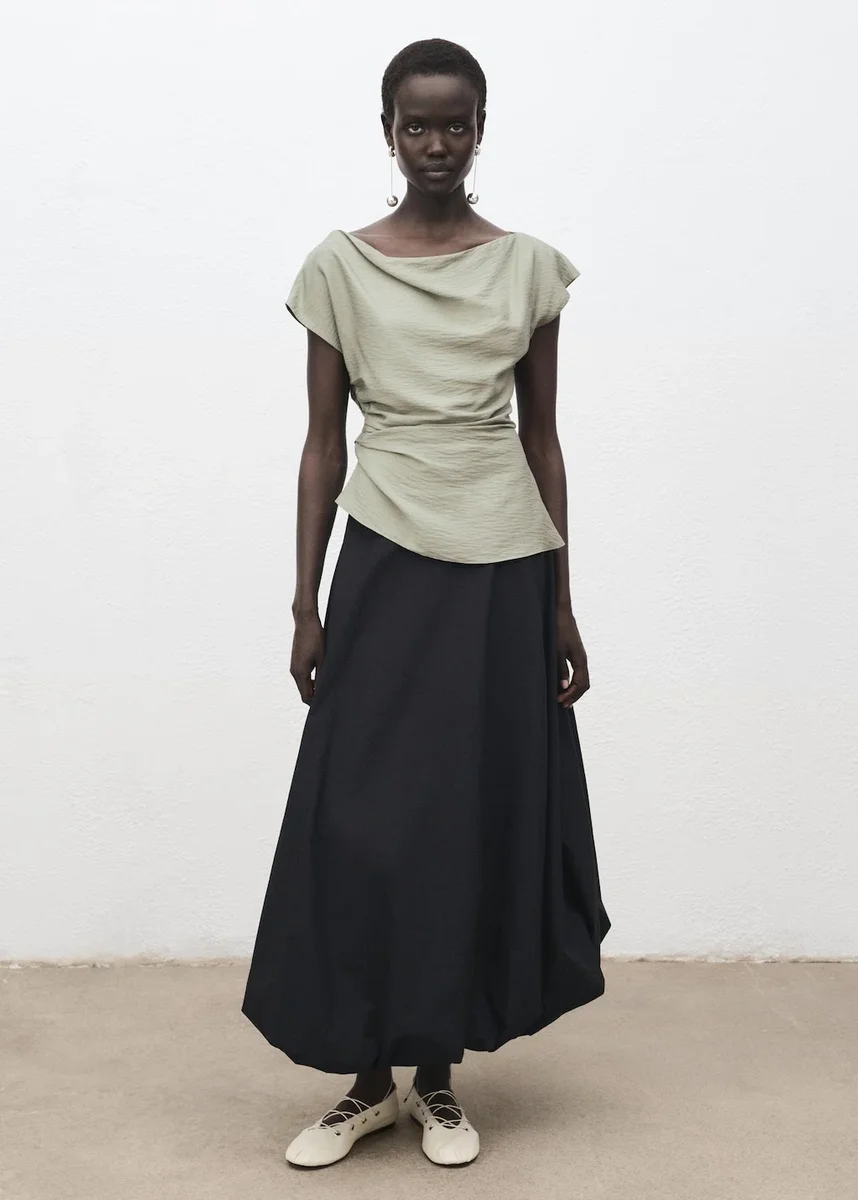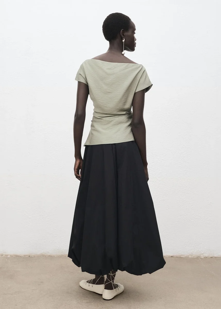 Tento oděv je vyroben z texturované modální tkaniny a má přiléhavý střih a asymetrický výstřih. Má krátké rukávy, boční řasení a boční zapínání na zip. K dispozici v nadměrných velikostech